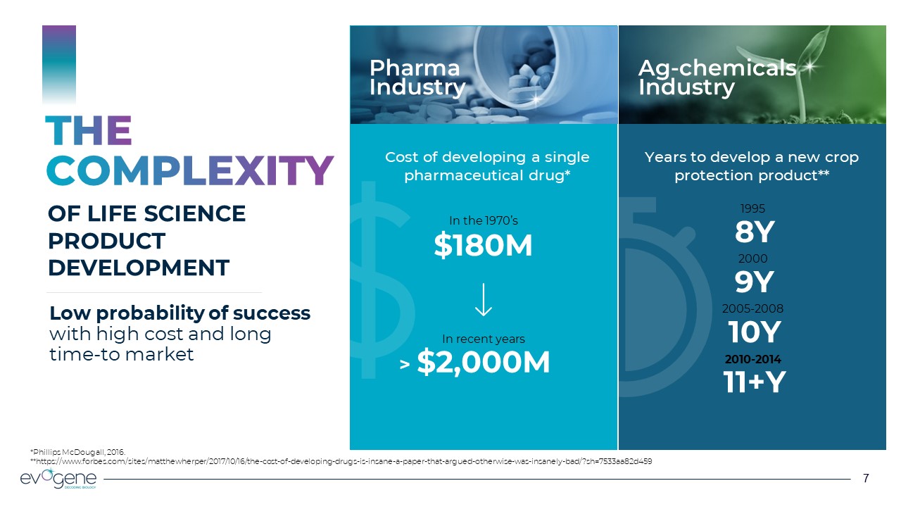 THE COMPLEXITY   OF LIFE SCIENCE PRODUCT DEVELOPMENT  Low probability of successwith high cost and long time-to market   Pharma Industry  Cost of developing a single pharmaceutical drug*  In the 1970’s  $180M  In recent years  $2,000M  >  Ag-chemicalsIndustry  Years to develop a new crop protection product**  1995  8Y  1995  8Y  2000  9Y  2005-2008  10Y  2010-2014  11+Y  *Phillips McDougall, 2016.  **https://www.forbes.com/sites/matthewherper/2017/10/16/the-cost-of-developing-drugs-is-insane-a-paper-that-argued-otherwise-was-insanely-bad/?sh=7533aa82d459  7