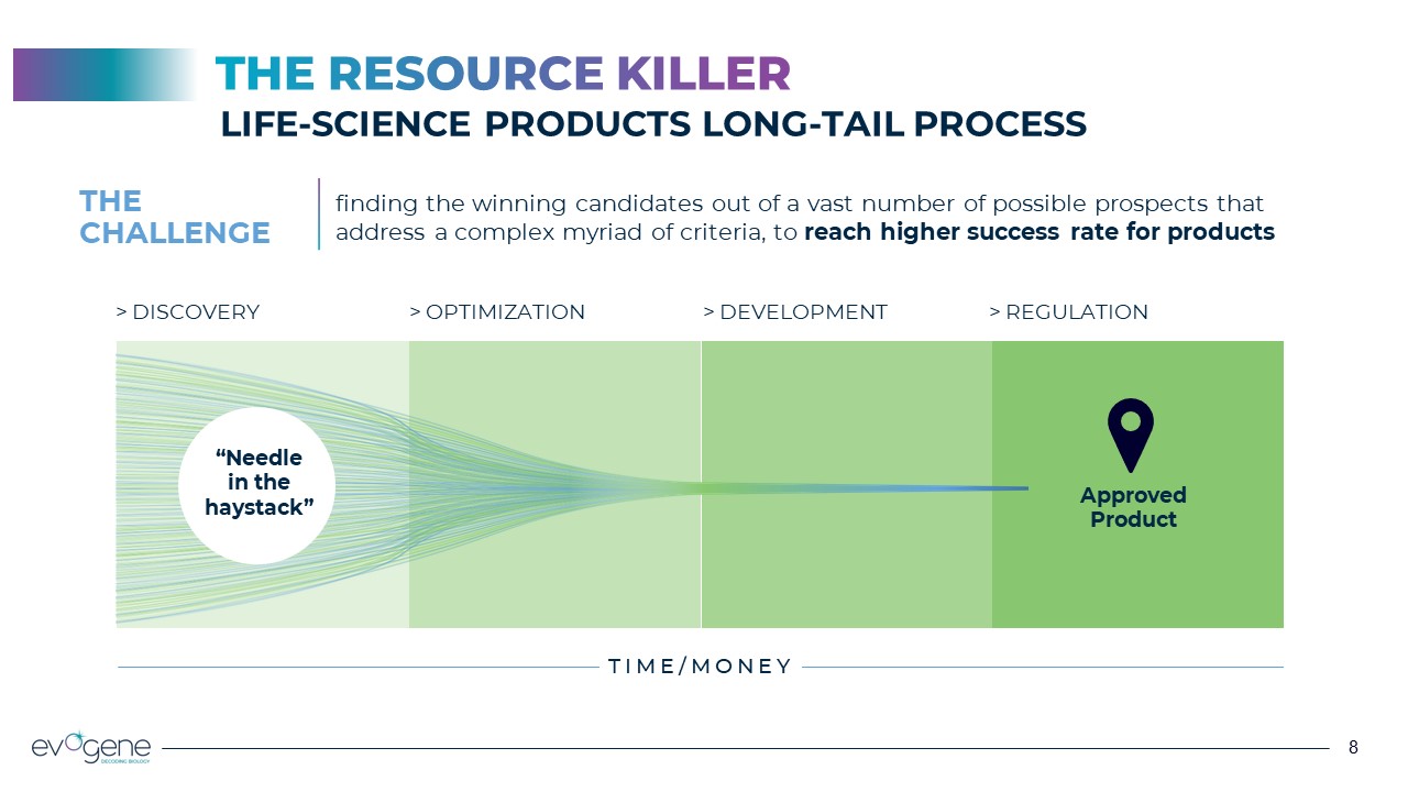THE RESOURCE KILLER  LIFE-SCIENCE PRODUCTS LONG-TAIL PROCESS   > DISCOVERY  > OPTIMIZATION  > DEVELOPMENT  > REGULATION  THE CHALLENGE  finding the winning candidates out of a vast number of possible prospects that address a complex myriad of criteria, to reach higher success rate for products   “Needle in the haystack”  TIME/MONEY  ApprovedProduct  8