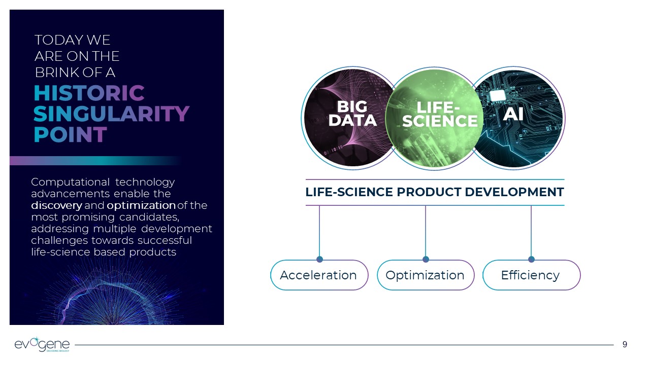 BIG  DATA  AI  HISTORIC SINGULARITYPOINT  TODAY WE ARE ON THE BRINK OF A  Computational technology advancements enable the discovery and optimization of the most promising candidates, addressing multiple development challenges towards successful life-science based products  LIFE-SCIENCE PRODUCT DEVELOPMENT  Acceleration  Optimization  Efficiency  LIFE- SCIENCE  9
