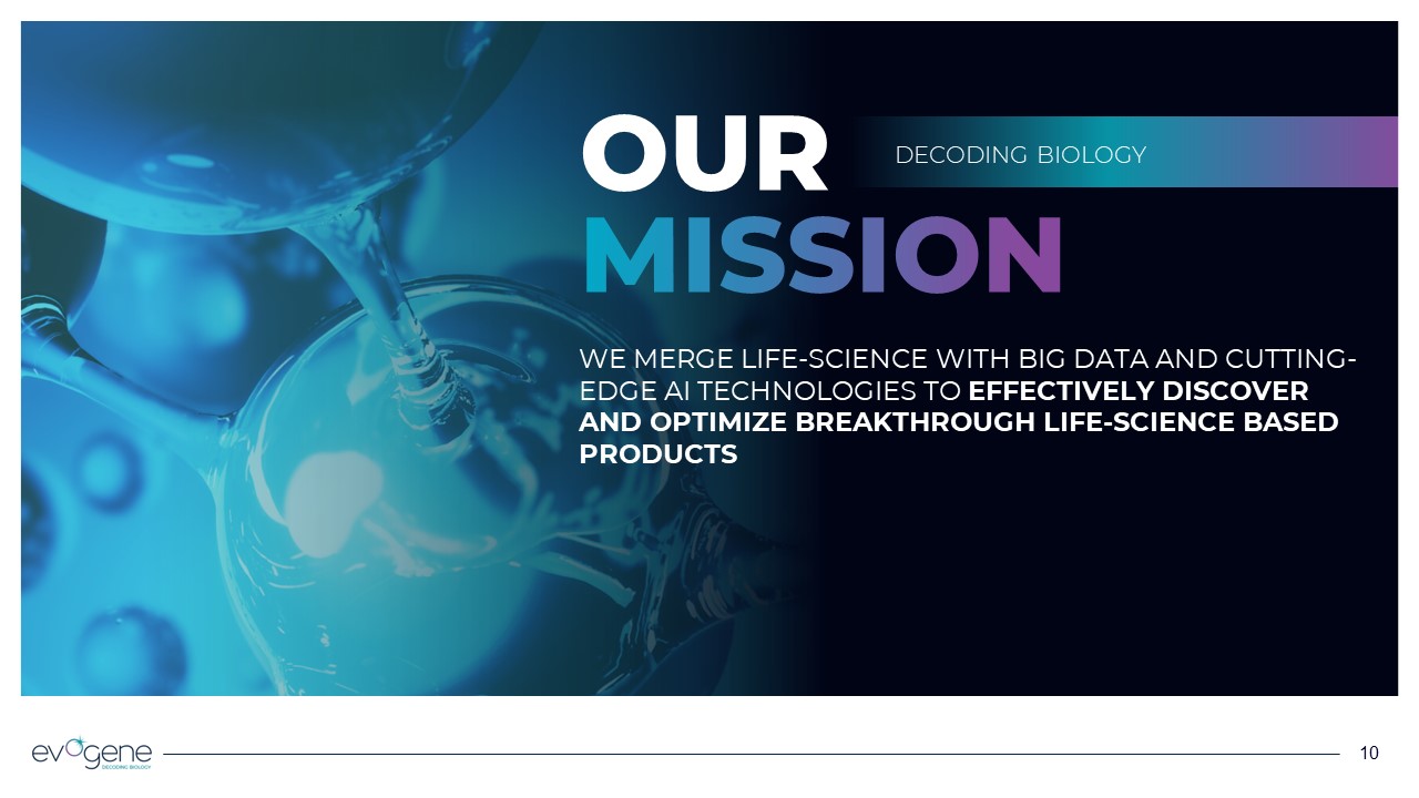 10  OUR   MISSION  AS PIONEERS AT THE FRONTIER, WE ARE DEDICATED TO REVOLUTIONIZING THIS FIELD. WE HARNESS CUTTING-EDGE COMPUTATIONAL BIOLOGY TECHNOLOGIES TO DRIVE PROGRESS, ENSURING OUR LEADERSHIP IN CREATING SOLUTIONS THAT PROPEL HUMANITY TOWARDS A BRIGHTER TOMORROW.  DECODING BIOLOGY  WE MERGE LIFE-SCIENCE WITH BIG DATA AND CUTTING-EDGE AI TECHNOLOGIES TO EFFECTIVELY DISCOVER AND OPTIMIZE BREAKTHROUGH LIFE-SCIENCE BASED PRODUCTS