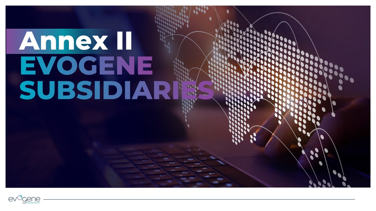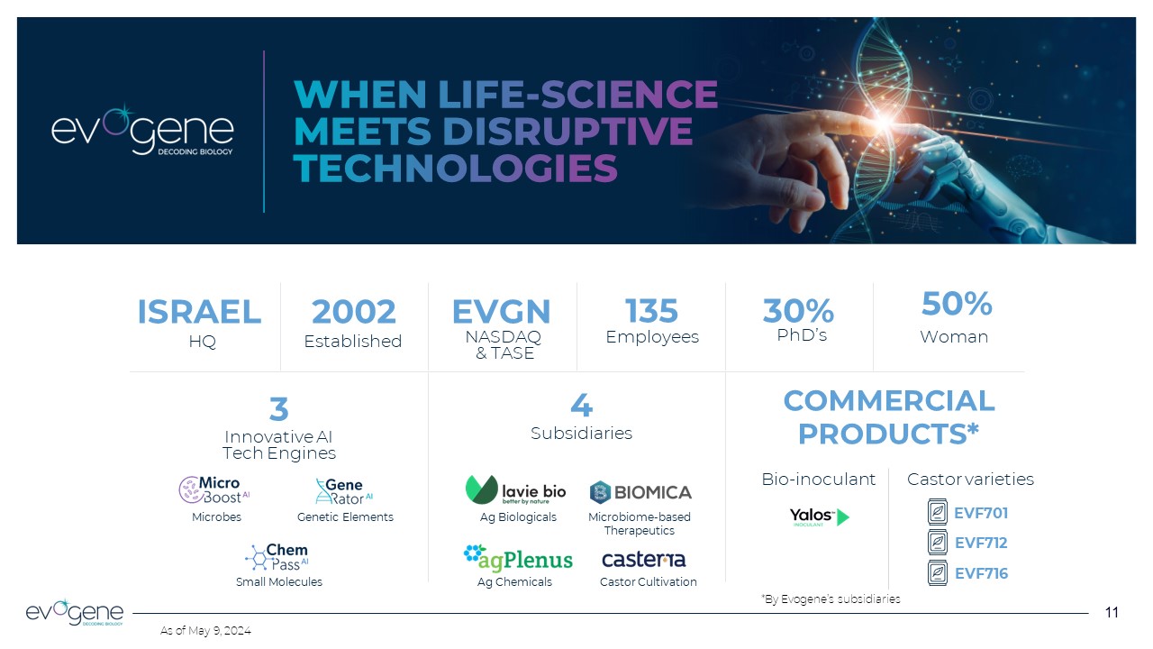 WHEN LIFE-SCIENCE MEETS DISRUPTIVE TECHNOLOGIES  ISRAEL  HQ  EVGN  NASDAQ   & TASE  Employees  4  Subsidiaries  3  Innovative AITech Engines  PhD’s  2002  Established  50%  Woman  11  COMMERCIAL  PRODUCTS*  Microbes  Small Molecules   Genetic Elements   Microbiome-based Therapeutics  Ag Biologicals  Ag Chemicals  Castor Cultivation  Castor varieties  Bio-inoculant  *By Evogene’s subsidiaries  EVF701  EVF712  EVF716  As of May 9, 2024  135  30%