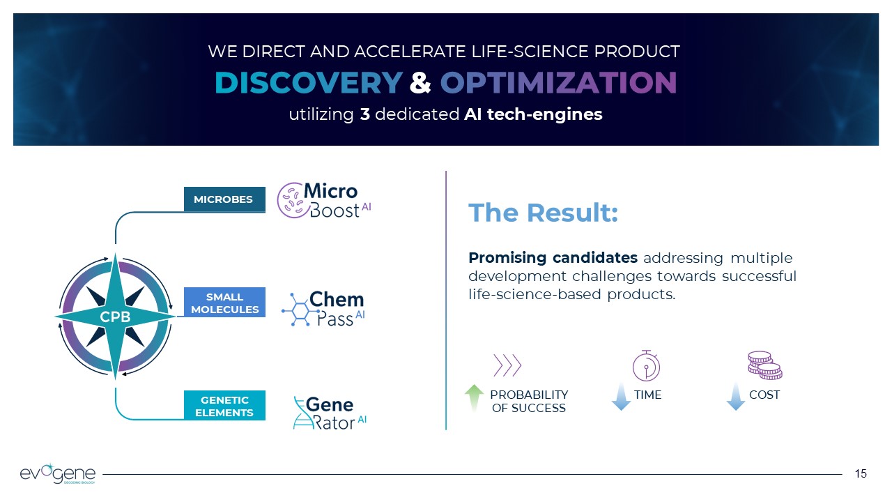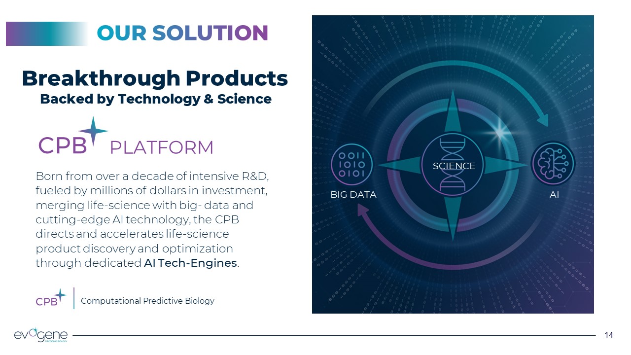 BIG DATA  SCIENCE  AI  OUR SOLUTION  Born from over a decade of intensive R&D, fueled by millions of dollars in investment, merging life-science with big- data and cutting-edge AI technology, the CPB directs and accelerates life-science product discovery and optimization through dedicated AI Tech-Engines.  Computational Predictive Biology  14  Breakthrough Products   Backed by Technology & Science   PLATFORM
