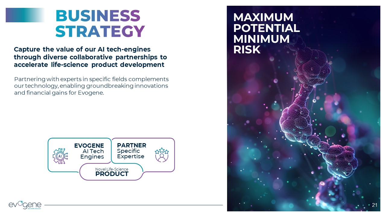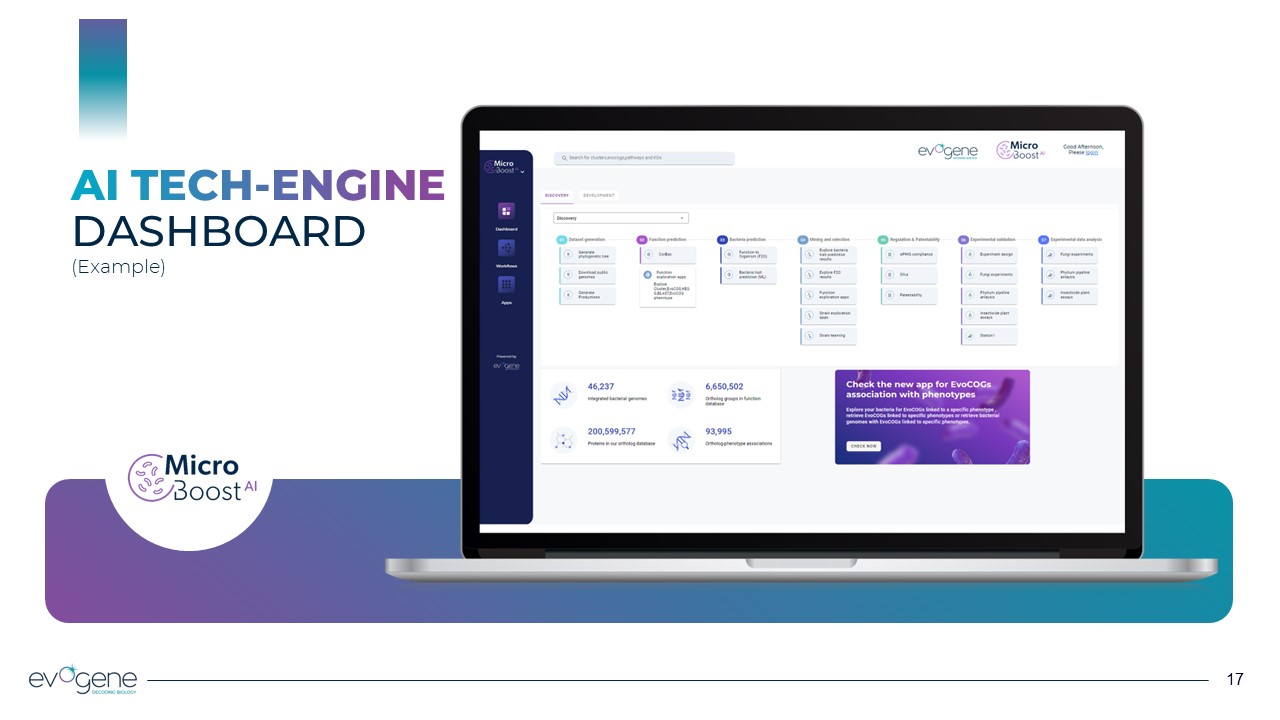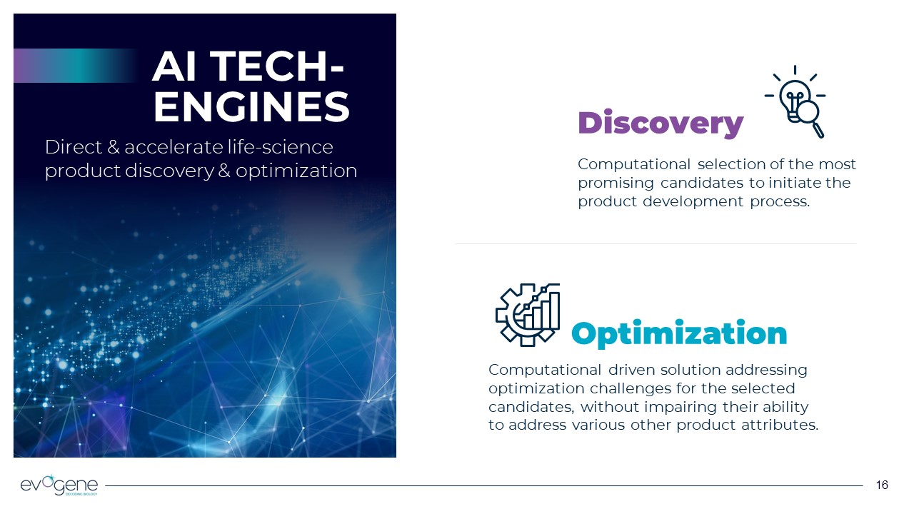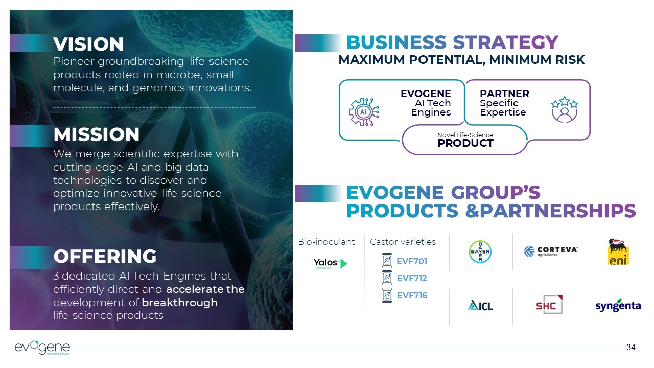 VISION  Pioneer groundbreaking life-science products rooted in microbe, small molecule, and genomics innovations.  We merge scientific expertise with cutting-edge AI and big data technologies to discover and optimize innovative life-science products effectively.  MISSION  BUSINESS STRATEGY  MAXIMUM POTENTIAL, MINIMUM RISK  EVOGENE   AI Tech Engines  Novel Life-Science   PRODUCT  PARTNER  Specific Expertise  3 dedicated AI Tech-Engines that efficiently direct and accelerate the development of breakthrough life-science products  OFFERING  EVOGENE GROUP’S  PRODUCTS &PARTNERSHIPS   34  Castor varieties  Bio-inoculant  EVF701  EVF712  EVF716