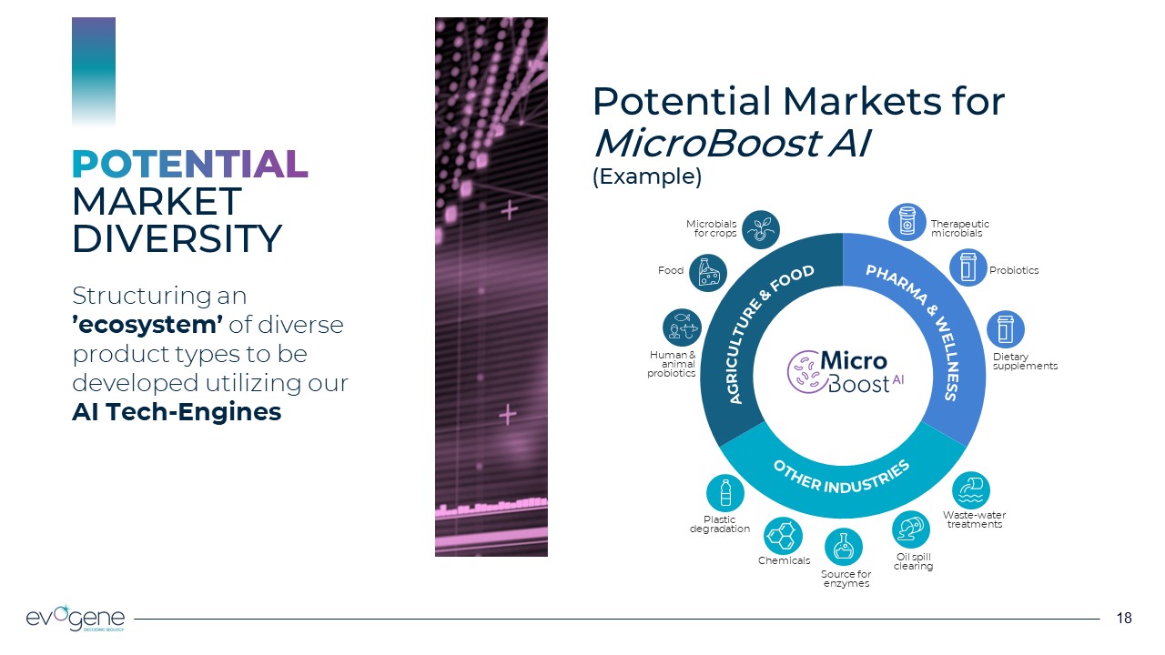 AGRICULTURE & FOOD  PHARMA & WELLNESS  OTHER INDUSTRIES  18  POTENTIAL MARKET DIVERSITY  Structuring an ’ecosystem’ of diverse product types to be developed utilizing our AI Tech-Engines  Potential Markets for MicroBoost AI  (Example)  Plasticdegradation  Chemicals  Source forenzymes  Oil spillclearing  Waste-watertreatments  Microbialsfor crops  Food  Human &animal probiotics  Therapeuticmicrobials  Probiotics  Dietarysupplements