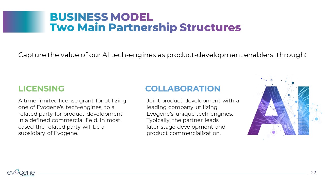 21  BUSINESS STRATEGY  Capture the value of our AI tech-engines through diverse collaborative partnerships to accelerate life-science product development  Partnering with experts in specific fields complements our technology, enabling groundbreaking innovations and financial gains for Evogene.  EVOGENE AI Tech Engines  Novel Life-Science   PRODUCT  PARTNER  Specific Expertise  MAXIMUM POTENTIAL MINIMUM RISK  21