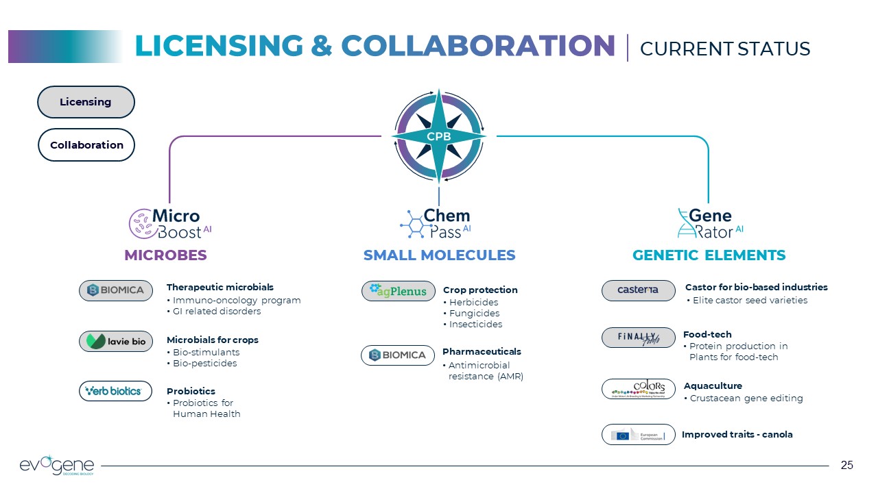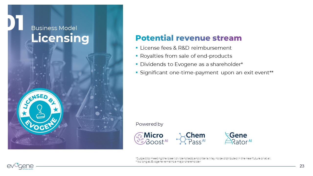 23  01  Licensing   Potential revenue stream    License fees & R&D reimbursement    Royalties from sale of end-products  Dividends to Evogene as a shareholder*   Significant one-time-payment upon an exit event**  Powered by  Business Model   *Subject to meeting the Israeli dividend tests and criteria. May no be distributed in the near future or at all.   **As long as Evogene remains a major shareholder