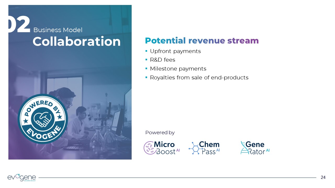24  02  Business Model   Collaboration  Powered by  Potential revenue stream   Upfront payments   R&D fees   Milestone payments   Royalties from sale of end-products