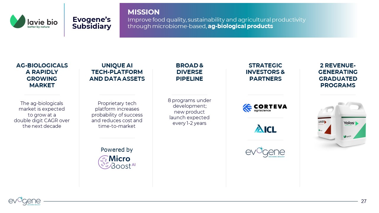 AG-BIOLOGICALS   A RAPIDLY GROWINGMARKET  UNIQUE AI TECH-PLATFORM AND DATA ASSETS  BROAD &DIVERSEPIPELINE  8 programs under development;new product launch expected every 1-2 years  Proprietary tech platform increases probability of success and reduces cost and time-to-market   The ag-biologicals market is expected to grow at a double digit CAGR over the next decade  STRATEGIC INVESTORS & PARTNERS  2 REVENUE-GENERATING GRADUATED PROGRAMS  Powered by  MISSION  Improve food quality, sustainability and agricultural productivity through microbiome-based, ag-biological products  27  Evogene’s Subsidiary