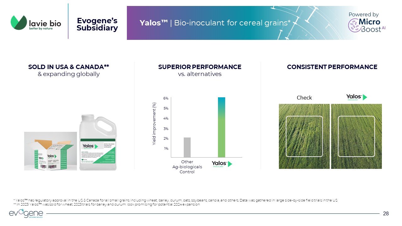 Powered by  Yalos™ | Bio-inoculant for cereal grains*  28  SOLD IN USA & CANADA**& expanding globally  SUPERIOR PERFORMANCEvs. alternatives  CONSISTENT PERFORMANCE   2%  1%  3%  4%  6%  Other Ag-biologicals Control  Yield improvement (%)   5%  Check  Evogene’s Subsidiary  * Yalos™ has regulatory approval in the US & Canada for all small grains including wheat, barley, durum, oats, soybeans, canola, and others. Data was gathered in large side-by-side field trials in the US  ** In 2023 Yalos™ was sold for wheat. 2023 trials for barley and durum look promising for potential 2024 expansion