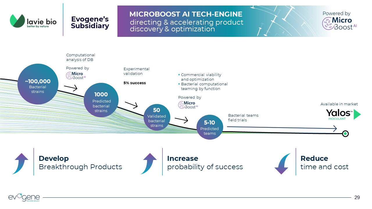 Powered by  MICROBOOST AI TECH-ENGINE   29  directing & accelerating product discovery & optimization  Computational analysis of DB  ~100,000  Bacterialstrains  1000 Predicted  bacterial strains  50 Validated  bacterialstrains  5-10 Predicted  teams  Powered by  Experimental validation  5% success  Commercial viability and optimization  Bacterial computational teaming by function  Powered by  Bacterial teams field trials  Increaseprobability of success  Reducetime and cost  Available in market  DevelopBreakthrough Products  Evogene’s Subsidiary