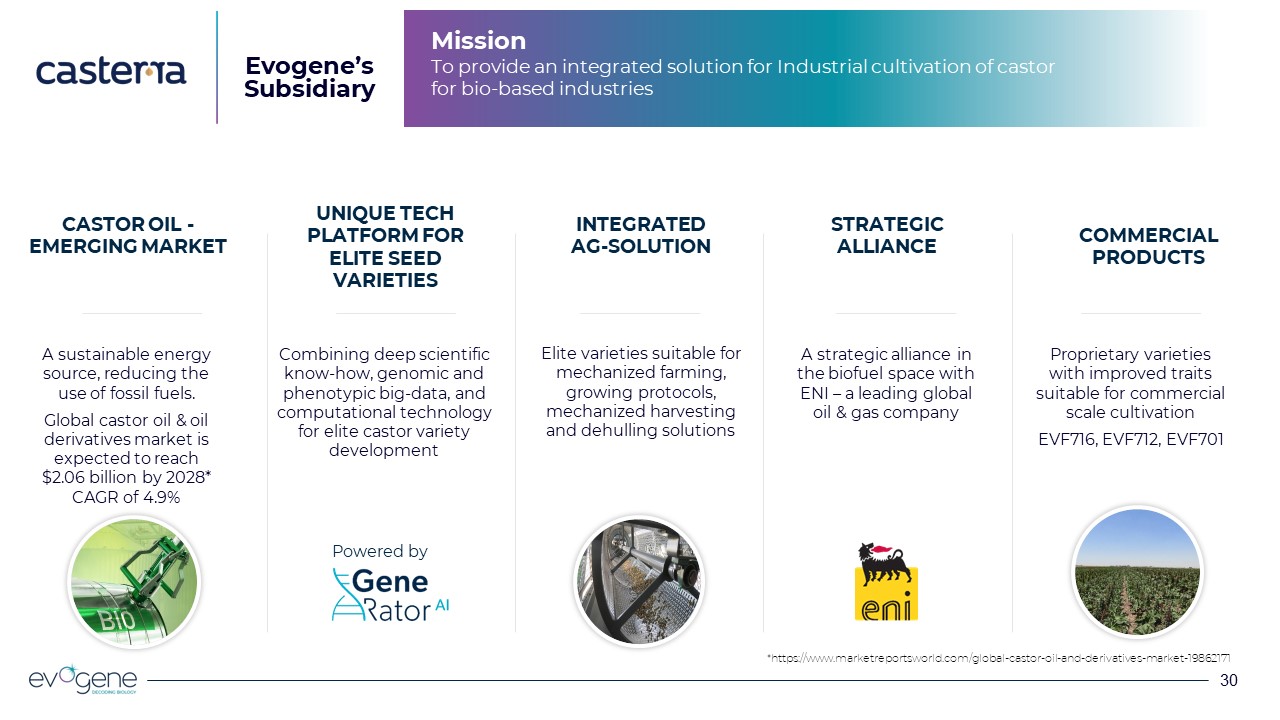 CASTOR OIL - EMERGING MARKET   INTEGRATED   AG-SOLUTION  COMMERCIAL PRODUCTS  Proprietary varieties with improved traits suitable for commercial scale cultivation   EVF716, EVF712, EVF701  Elite varieties suitable for mechanized farming, growing protocols, mechanized harvesting and dehulling solutions  A sustainable energy source, reducing the use of fossil fuels.  Global castor oil & oil derivatives market is expected to reach $2.06 billion by 2028*CAGR of 4.9%   UNIQUE TECH PLATFORM FOR ELITE SEED VARIETIES  STRATEGIC ALLIANCE  Combining deep scientific know-how, genomic and phenotypic big-data, and computational technology for elite castor variety development  A strategic alliance in the biofuel space with ENI – a leading global oil & gas company  Powered by  *https://www.marketreportsworld.com/global-castor-oil-and-derivatives-market-19862171  Evogene’s Subsidiary  Mission  To provide an integrated solution for Industrial cultivation of castor   for bio-based industries  30