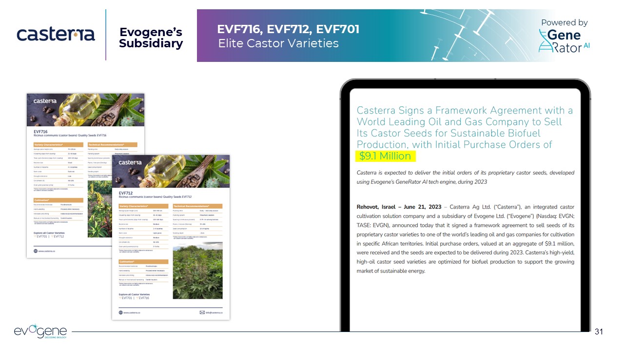 Powered by  Evogene’s Subsidiary  EVF716, EVF712, EVF701   31  Elite Castor Varieties   $9.1 Million