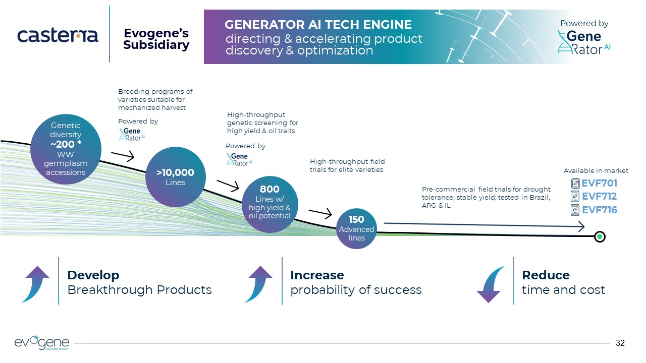 EVF701  EVF712  EVF716  Powered by  32  GENERATOR AI TECH ENGINE  directing & accelerating product discovery & optimization  Genetic diversity  ~200 *   WW germplasm accessions  >10,000 Lines  800   Lines w/ high yield & oil potential  150  Advanced lines  High-throughput field trials for elite varieties  Breeding programs of varieties suitable for mechanized harvest  Powered by  High-throughput genetic screening for high yield & oil traits  Powered by  Pre-commercial field trials for drought tolerance, stable yield; tested in Brazil, ARG & IL  Available in market  Increaseprobability of success  Reducetime and cost  DevelopBreakthrough Products  Evogene’s Subsidiary