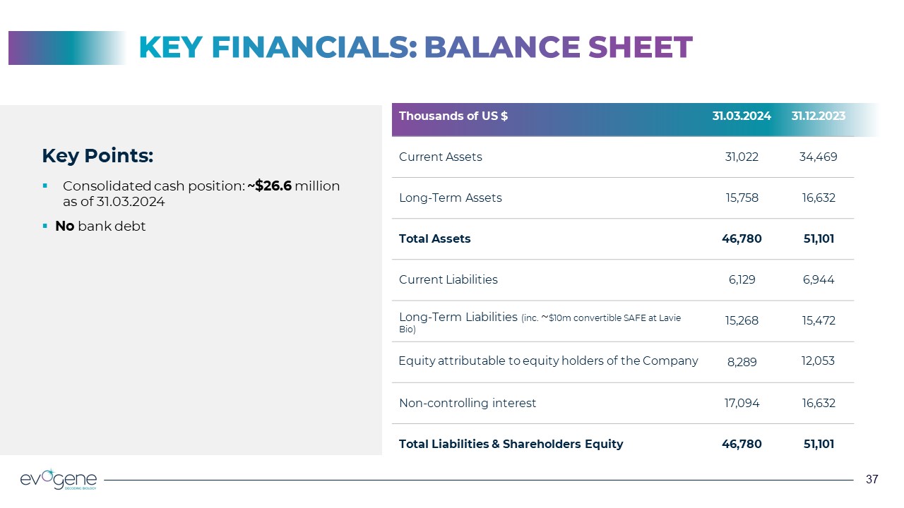 Thousands of US $  31.03.2024  31.12.2023  Current Assets  31,022  34,469  Long-Term Assets  15,758  16,632  Total Assets  46,780  51,101  Current Liabilities  6,129  6,944  Long-Term Liabilities (inc. ~$10m convertible SAFE at Lavie Bio)  15,268  15,472  Equity attributable to equity holders of the Company  8,289  12,053  Non-controlling interest   17,094  16,632  Total Liabilities & Shareholders Equity  46,780  51,101  KEY FINANCIALS: BALANCE SHEET  37  Key Points:  Consolidated cash position: ~$26.6 million as of 31.03.2024  No bank debt