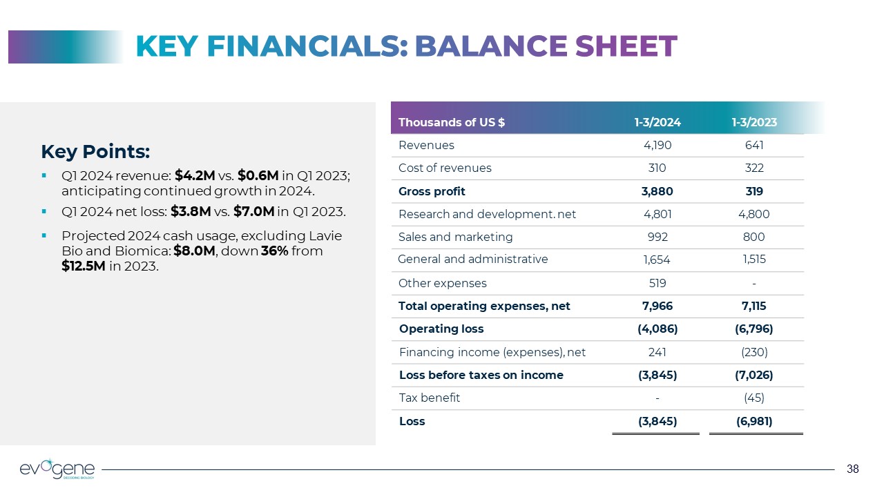 KEY FINANCIALS: BALANCE SHEET  38  Key Points:  Q1 2024 revenue: $4.2M vs. $0.6M in Q1 2023; anticipating continued growth in 2024.  Q1 2024 net loss: $3.8M vs. $7.0M in Q1 2023.   Projected 2024 cash usage, excluding Lavie Bio and Biomica: $8.0M, down 36% from $12.5M in 2023.  Thousands of US $  1-3/2024  1-3/2023  Revenues  4,190  641  Cost of revenues  310  322  Gross profit  3,880  319  Research and development. net  4,801  4,800  Sales and marketing  992  800  General and administrative  1,654  1,515  Other expenses  519  -  Total operating expenses, net  7,966  7,115  Operating loss  (4,086)  (6,796)  Financing income (expenses), net  241  (230)  Loss before taxes on income  (3,845)  (7,026)  Tax benefit  -  (45)  Loss  (3,845)  (6,981)
