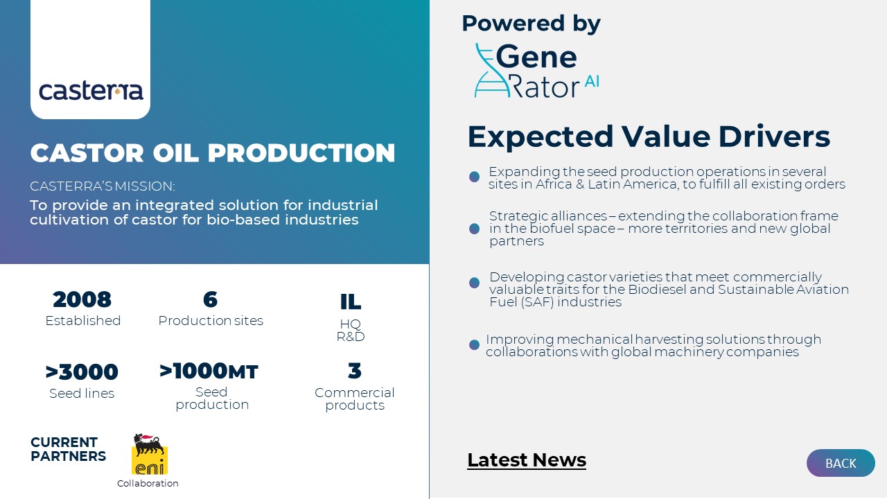 CASTOR OIL PRODUCTION  CASTERRA’S MISSION:  To provide an integrated solution for industrial cultivation of castor for bio-based industries  BACK  2008  6  >3000  >1000MT   Established  Production sites  Seed lines  HQR&D  Expected Value Drivers  Expanding the seed production operations in several sites in Africa & Latin America, to fulfill all existing orders  Strategic alliances – extending the collaboration frame in the biofuel space – more territories and new global partners   Developing castor varieties that meet commercially valuable traits for the Biodiesel and Sustainable Aviation Fuel (SAF) industries   Improving mechanical harvesting solutions through collaborations with global machinery companies  Latest News  Powered by  CURRENT PARTNERS  Collaboration  IL  3  Commercial products  Seed production