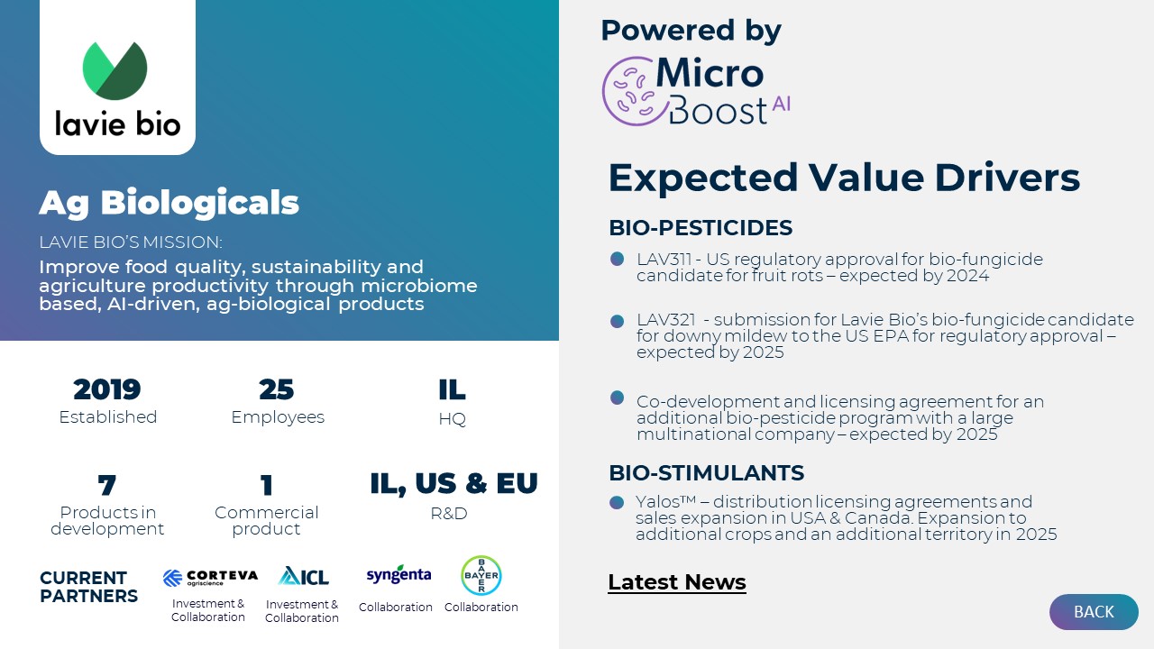 Ag Biologicals  LAVIE BIO’S MISSION:  Improve food quality, sustainability and agriculture productivity through microbiome based, AI-driven, ag-biological products  2019  25  1  7  Established  Employees  Commercial product  Products in development  BIO-STIMULANTS  Yalos™ – distribution licensing agreements and sales expansion in USA & Canada. Expansion to additional crops and an additional territory in 2025  BIO-PESTICIDES  LAV311 - US regulatory approval for bio-fungicide candidate for fruit rots – expected by 2024  LAV321 - submission for Lavie Bio’s bio-fungicide candidate for downy mildew to the US EPA for regulatory approval – expected by 2025  Co-development and licensing agreement for an additional bio-pesticide program with a large multinational company – expected by 2025  BACK  IL  HQ  IL, US & EU  R&D  Powered by  Expected Value Drivers  Latest News  CURRENT PARTNERS  Investment & Collaboration  Collaboration  Investment & Collaboration  Collaboration