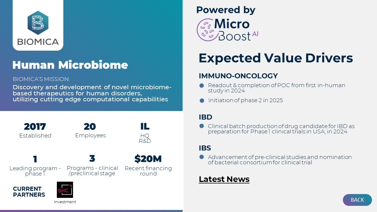 Human Microbiome  BIOMICA’S MISSION:  Discovery and development of novel microbiome-based therapeutics for human disorders, utilizing cutting edge computational capabilities   2017  20  3  1  $20M  Established  Employees  Programs - clinical /preclinical stage   Leading program - phase 1  Recent financing round  Expected Value Drivers  IMMUNO-ONCOLOGY  Readout & completion of POC from first in-human study in 2024  IBD  Clinical batch production of drug candidate for IBD as preparation for Phase 1 clinical trials in USA, in 2024  IBS  Advancement of pre-clinical studies and nomination of bacterial consortium for clinical trial   BACK  Latest News  Investment   Powered by  CURRENT PARTNERS  IL  HQR&D  Initiation of phase 2 in 2025