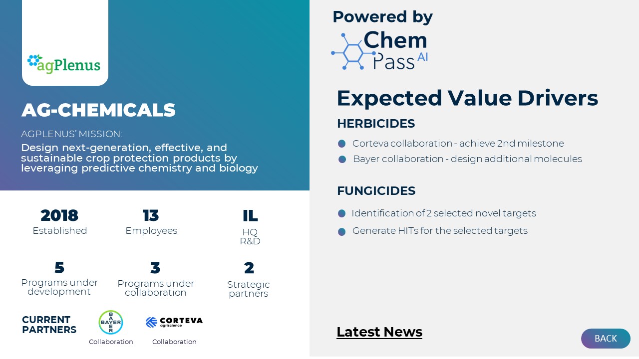 AG-CHEMICALS  AGPLENUS’ MISSION:  Design next-generation, effective, and sustainable crop protection products by leveraging predictive chemistry and biology  2018  13  5  3  Established  Employees  Programs under development  Programs under collaboration  HQR&D  Expected Value Drivers  HERBICIDES  Corteva collaboration - achieve 2nd milestone  FUNGICIDES  Identification of 2 selected novel targets  BACK  Latest News  Collaboration  Collaboration  Powered by  CURRENT PARTNERS  IL  Strategic partners  2  Generate HITs for the selected targets  Bayer collaboration - design additional molecules