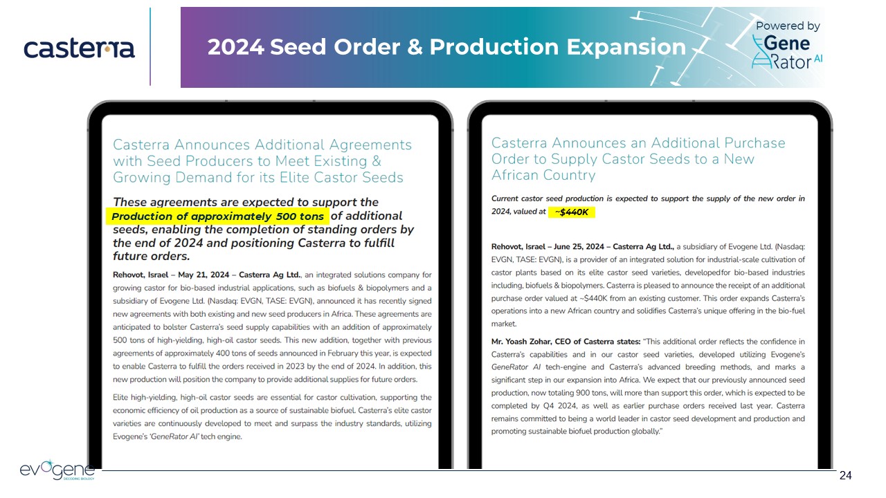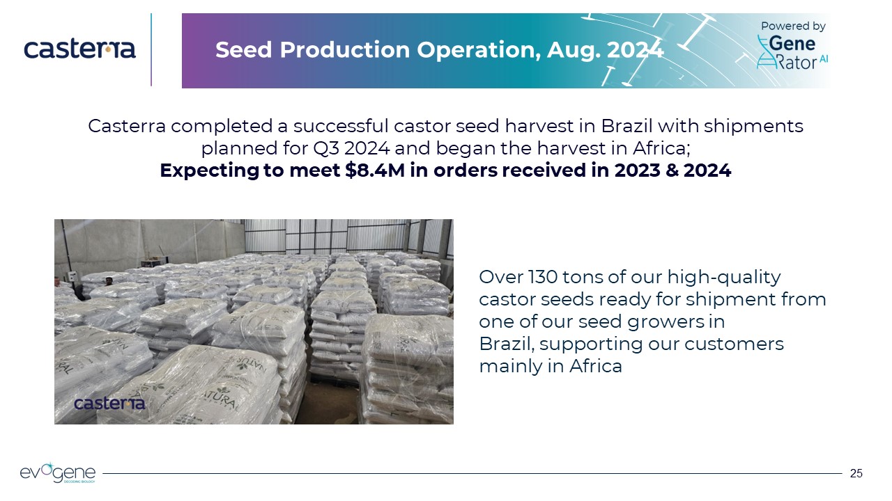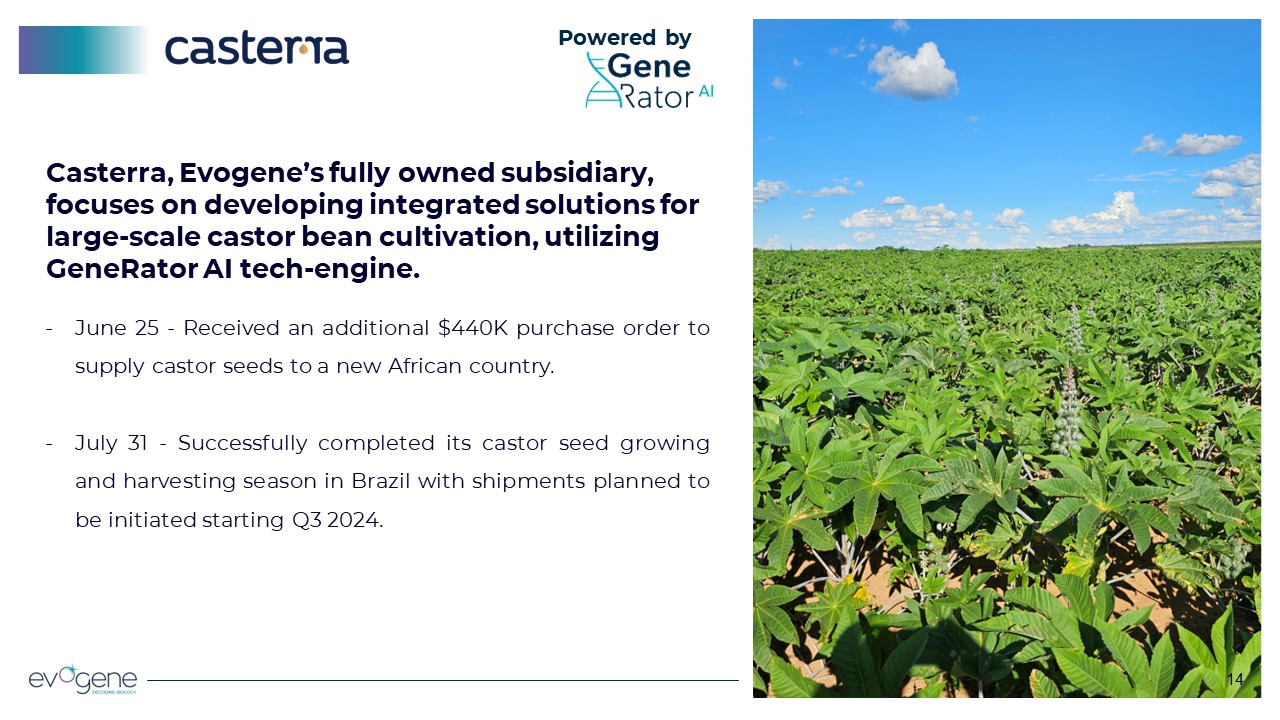 14  Casterra, Evogene’s fully owned subsidiary, focuses on developing integrated solutions for large-scale castor bean cultivation, utilizing GeneRator AI tech-engine.  June 25 - Received an additional $440K purchase order to supply castor seeds to a new African country.  July 31 - Successfully completed its castor seed growing and harvesting season in Brazil with shipments planned to be initiated starting Q3 2024.  Powered by