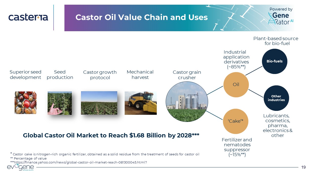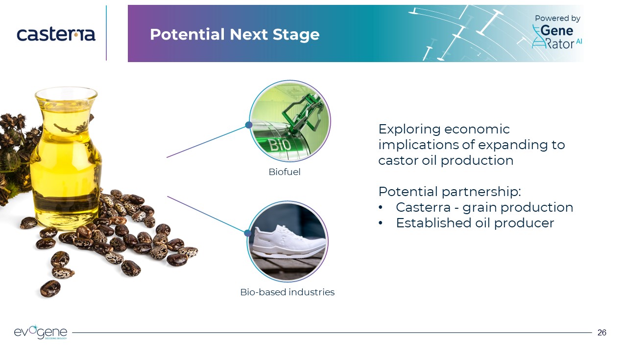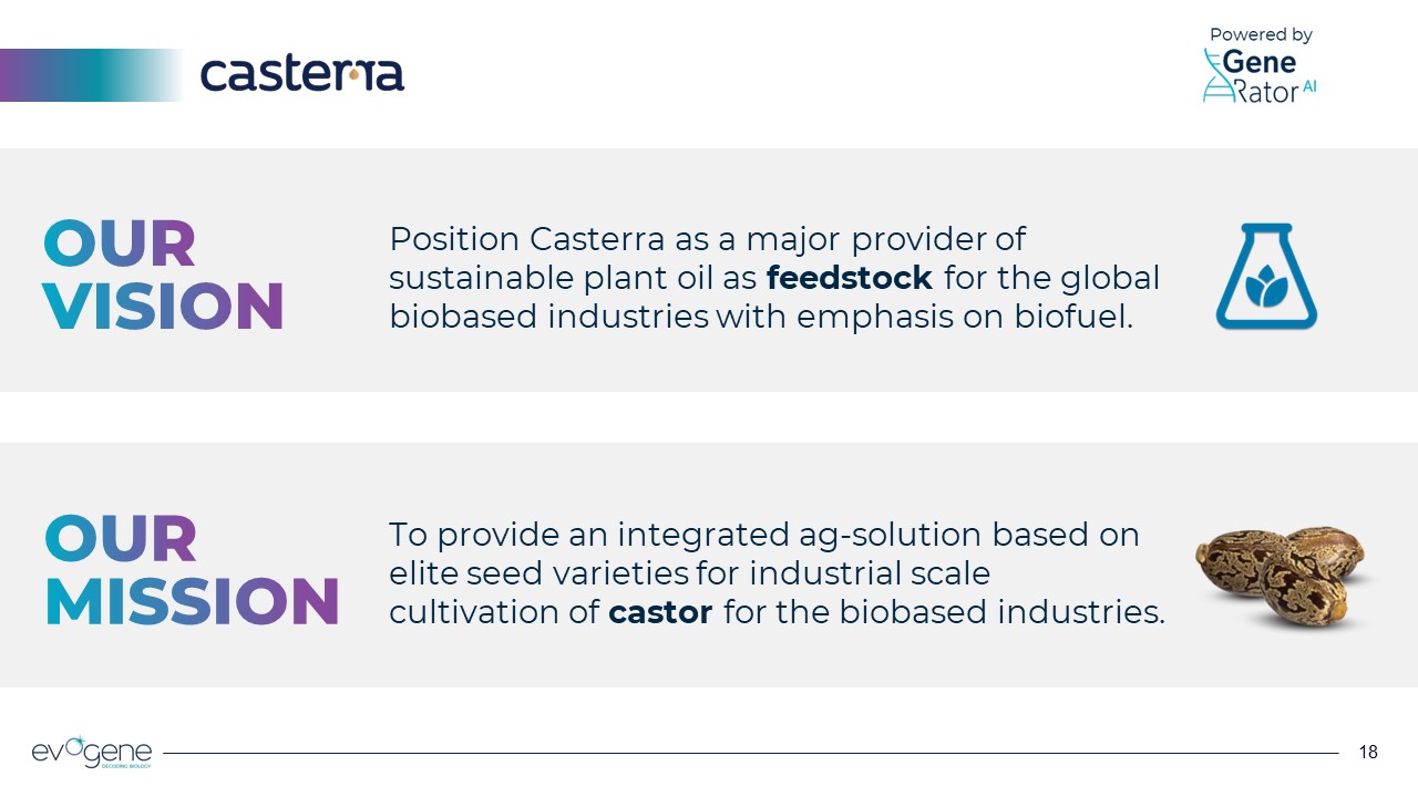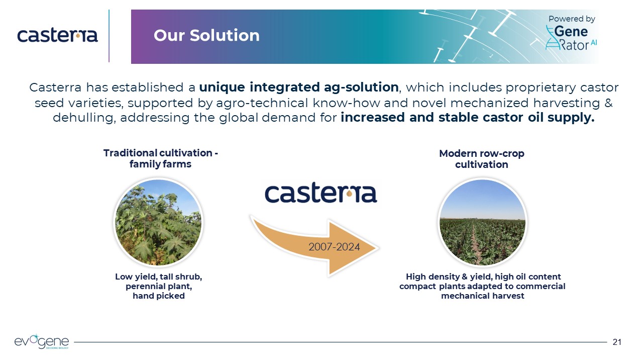 14  Casterra, Evogene’s fully owned subsidiary, focuses on developing integrated solutions for large-scale castor bean cultivation, utilizing GeneRator AI tech-engine.  June 25 - Received an additional $440K purchase order to supply castor seeds to a new African country.  July 31 - Successfully completed its castor seed growing and harvesting season in Brazil with shipments planned to be initiated starting Q3 2024.  Powered by