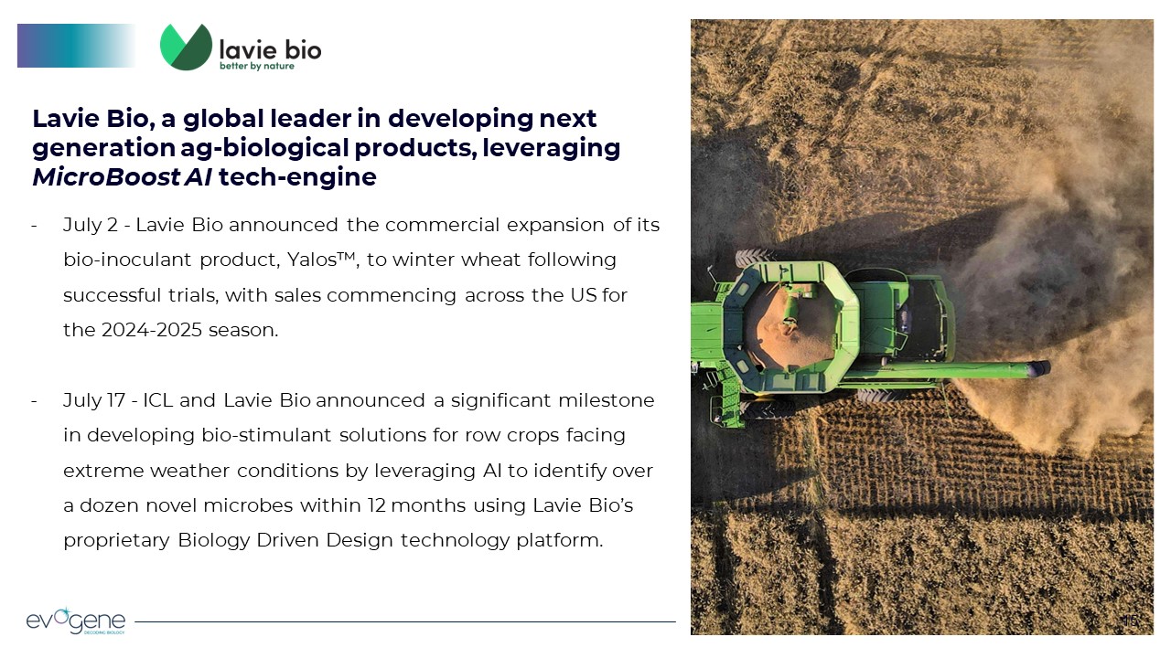15  Lavie Bio, a global leader in developing next generation ag-biological products, leveraging MicroBoost AI tech-engine   July 2 - Lavie Bio announced the commercial expansion of its bio-inoculant product, Yalos™, to winter wheat following successful trials, with sales commencing across the US for the 2024-2025 season.  July 17 - ICL and Lavie Bio announced a significant milestone in developing bio-stimulant solutions for row crops facing extreme weather conditions by leveraging AI to identify over a dozen novel microbes within 12 months using Lavie Bio’s proprietary Biology Driven Design technology platform.