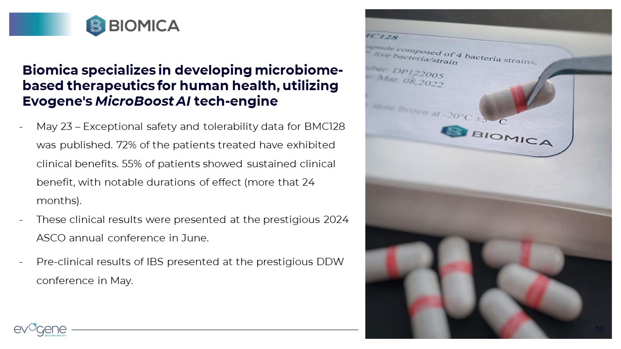 16  Biomica specializes in developing microbiome-based therapeutics for human health, utilizing Evogene's MicroBoost AI tech-engine  May 23 – Exceptional safety and tolerability data for BMC128 was published. 72% of the patients treated have exhibited clinical benefits. 55% of patients showed sustained clinical benefit, with notable durations of effect (more that 24 months).  These clinical results were presented at the prestigious 2024 ASCO annual conference in June.  Pre-clinical results of IBS presented at the prestigious DDW conference in May.  .