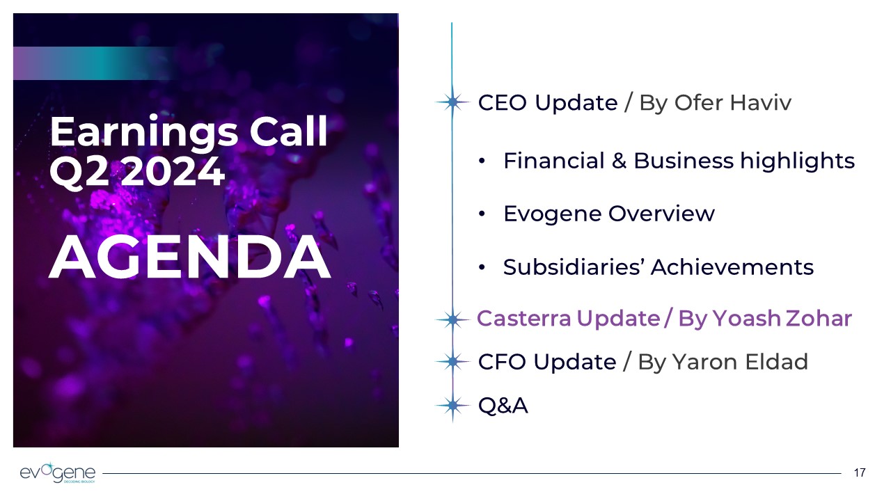 Earnings Call Q2 2024  AGENDA  Financial & Business highlights  Evogene Overview  Subsidiaries’ Achievements  CFO Update / By Yaron Eldad  Q&A  17  CEO Update / By Ofer Haviv  Casterra Update / By Yoash Zohar