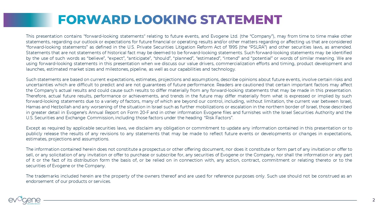 This presentation contains "forward-looking statements" relating to future events, and Evogene Ltd. (the “Company”), may from time to time make other statements, regarding our outlook or expectations for future financial or operating results and/or other matters regarding or affecting us that are considered “forward-looking statements” as defined in the U.S. Private Securities Litigation Reform Act of 1995 (the “PSLRA”) and other securities laws, as amended. Statements that are not statements of historical fact may be deemed to be forward-looking statements. Such forward-looking statements may be identified by the use of such words as “believe”, “expect”, “anticipate”, “should”, “planned”, “estimated”, “intend” and “potential” or words of similar meaning. We are using forward-looking statements in this presentation when we discuss our value drivers, commercialization efforts and timing, product development and launches, estimated market sizes and milestones, pipeline, as well as our capabilities and technology.   Such statements are based on current expectations, estimates, projections and assumptions, describe opinions about future events, involve certain risks and uncertainties which are difficult to predict and are not guarantees of future performance. Readers are cautioned that certain important factors may affect the Company's actual results and could cause such results to differ materially from any forward-looking statements that may be made in this presentation. Therefore, actual future results, performance or achievements, and trends in the future may differ materially from what is expressed or implied by such forward-looking statements due to a variety of factors, many of which are beyond our control, including, without limitation, the current war between Israel, Hamas and Hezbollah and any worsening of the situation in Israel such as further mobilizations or escalation in the northern border of Israel, those described in greater detail in Evogene's Annual Report on Form 20-F and in other information Evogene files and furnishes with the Israel Securities Authority and the U.S. Securities and Exchange Commission, including those factors under the heading “Risk Factors”.   Except as required by applicable securities laws, we disclaim any obligation or commitment to update any information contained in this presentation or to publicly release the results of any revisions to any statements that may be made to reflect future events or developments or changes in expectations, estimates, projections and assumptions.  The information contained herein does not constitute a prospectus or other offering document, nor does it constitute or form part of any invitation or offer to sell, or any solicitation of any invitation or offer to purchase or subscribe for, any securities of Evogene or the Company, nor shall the information or any part of it or the fact of its distribution form the basis of, or be relied on in connection with, any action, contract, commitment or relating thereto or to the securities of Evogene or the Company.  The trademarks included herein are the property of the owners thereof and are used for reference purposes only. Such use should not be construed as an endorsement of our products or services.  2  2  FORWARD LOOKING STATEMENT