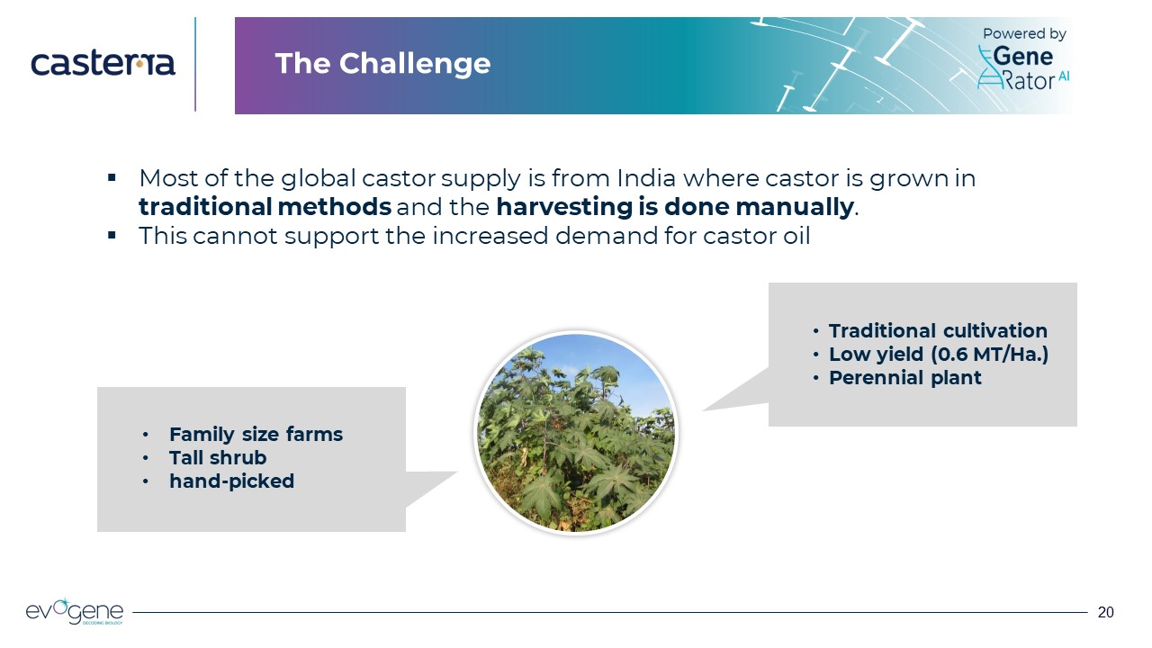 The Challenge  20  Family size farms  Tall shrub   hand-picked  Traditional cultivation  Low yield (0.6 MT/Ha.)  Perennial plant  Most of the global castor supply is from India where castor is grown in traditional methods and the harvesting is done manually.   This cannot support the increased demand for castor oil