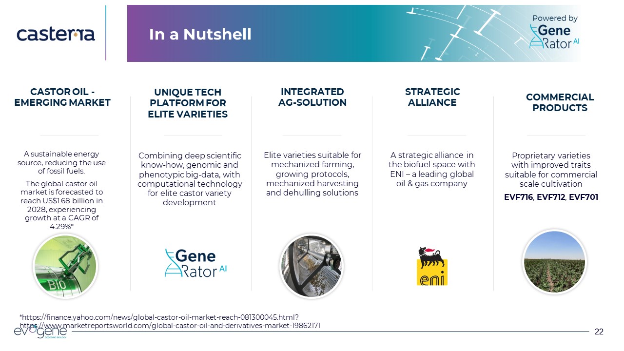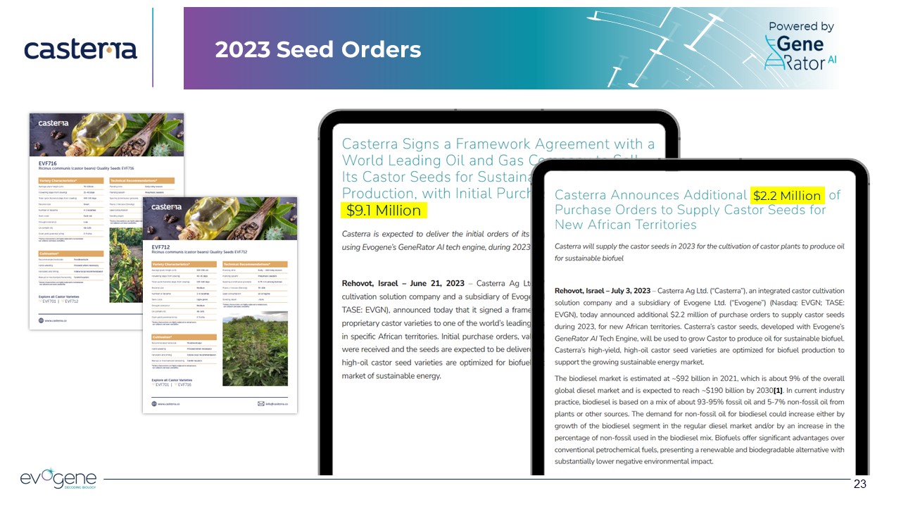 22  In a Nutshell  CASTOR OIL - EMERGING MARKET   INTEGRATED   AG-SOLUTION  COMMERCIAL PRODUCTS  Proprietary varieties with improved traits suitable for commercial scale cultivation   EVF716, EVF712, EVF701  Elite varieties suitable for mechanized farming, growing protocols, mechanized harvesting and dehulling solutions  A sustainable energy source, reducing the use of fossil fuels.  The global castor oil market is forecasted to reach US$1.68 billion in 2028, experiencing growth at a CAGR of 4.29%*  UNIQUE TECH PLATFORM FOR ELITE VARIETIES  STRATEGIC ALLIANCE  Combining deep scientific know-how, genomic and phenotypic big-data, with computational technology for elite castor variety development  A strategic alliance in the biofuel space with ENI – a leading global oil & gas company  *https://finance.yahoo.com/news/global-castor-oil-market-reach-081300045.html?  https://www.marketreportsworld.com/global-castor-oil-and-derivatives-market-19862171
