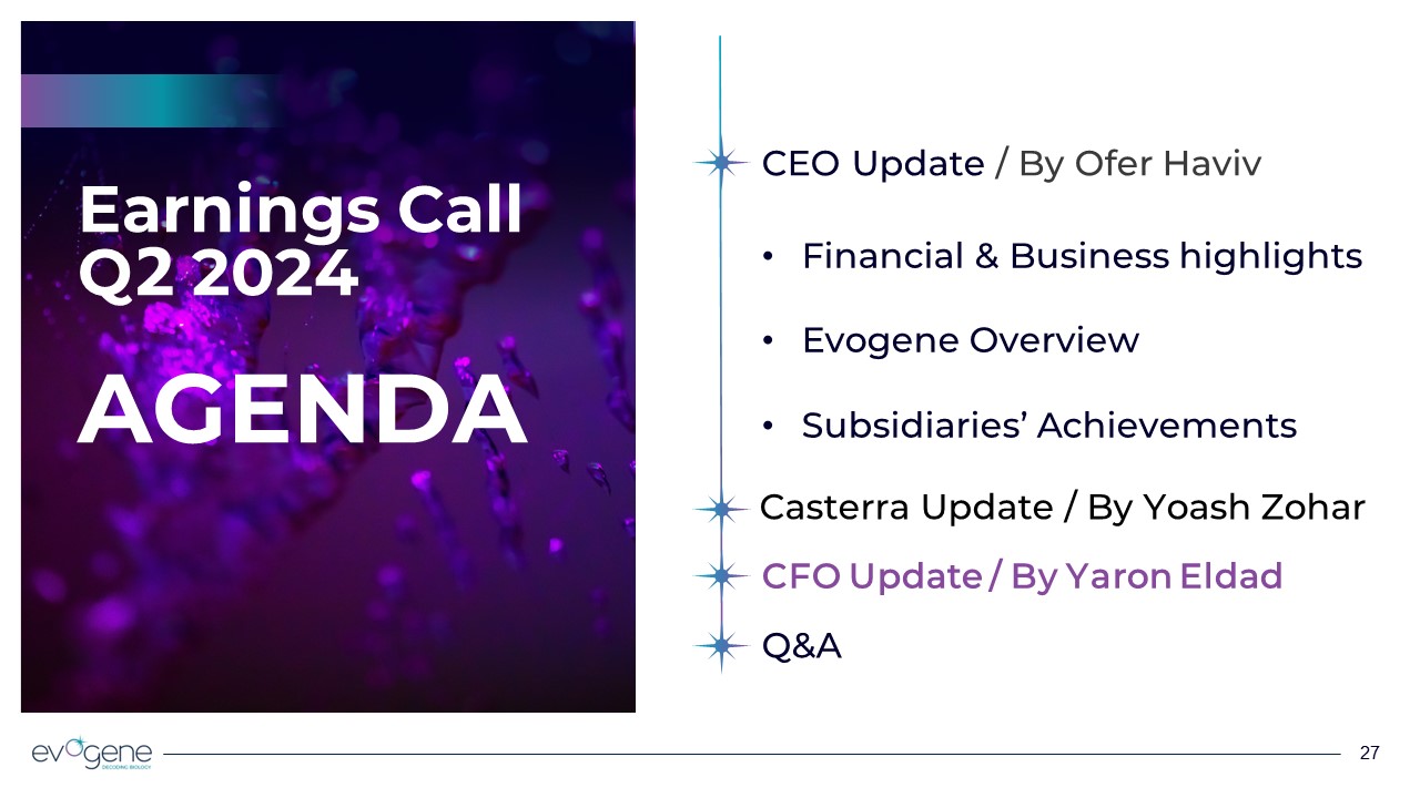 Earnings Call Q2 2024  AGENDA  Financial & Business highlights  Evogene Overview  Subsidiaries’ Achievements  CFO Update / By Yaron Eldad  Q&A  27  CEO Update / By Ofer Haviv  Casterra Update / By Yoash Zohar