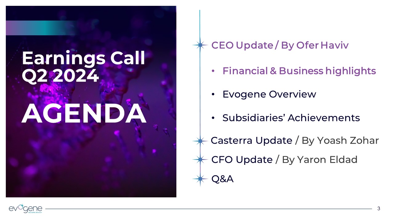 Earnings Call Q2 2024  AGENDA  Financial & Business highlights  Evogene Overview  Subsidiaries’ Achievements  CFO Update / By Yaron Eldad  Q&A  3  CEO Update / By Ofer Haviv  Casterra Update / By Yoash Zohar