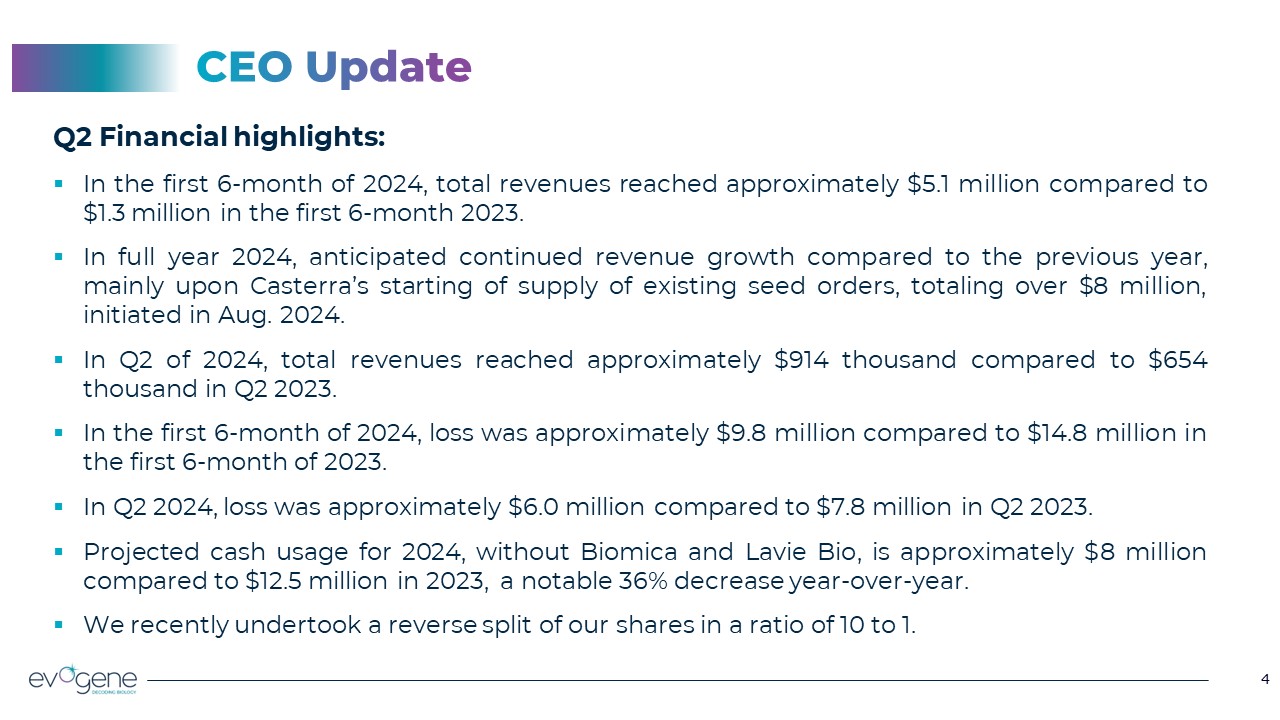 4  4  CEO Update  Q2 Financial highlights:  In the first 6-month of 2024, total revenues reached approximately $5.1 million compared to $1.3 million in the first 6-month 2023.   In full year 2024, anticipated continued revenue growth compared to the previous year, mainly upon Casterra’s starting of supply of existing seed orders, totaling over $8 million, initiated in Aug. 2024.  In Q2 of 2024, total revenues reached approximately $914 thousand compared to $654 thousand in Q2 2023.  In the first 6-month of 2024, loss was approximately $9.8 million compared to $14.8 million in the first 6-month of 2023.  In Q2 2024, loss was approximately $6.0 million compared to $7.8 million in Q2 2023.  Projected cash usage for 2024, without Biomica and Lavie Bio, is approximately $8 million compared to $12.5 million in 2023,  a notable 36% decrease year-over-year.  We recently undertook a reverse split of our shares in a ratio of 10 to 1.