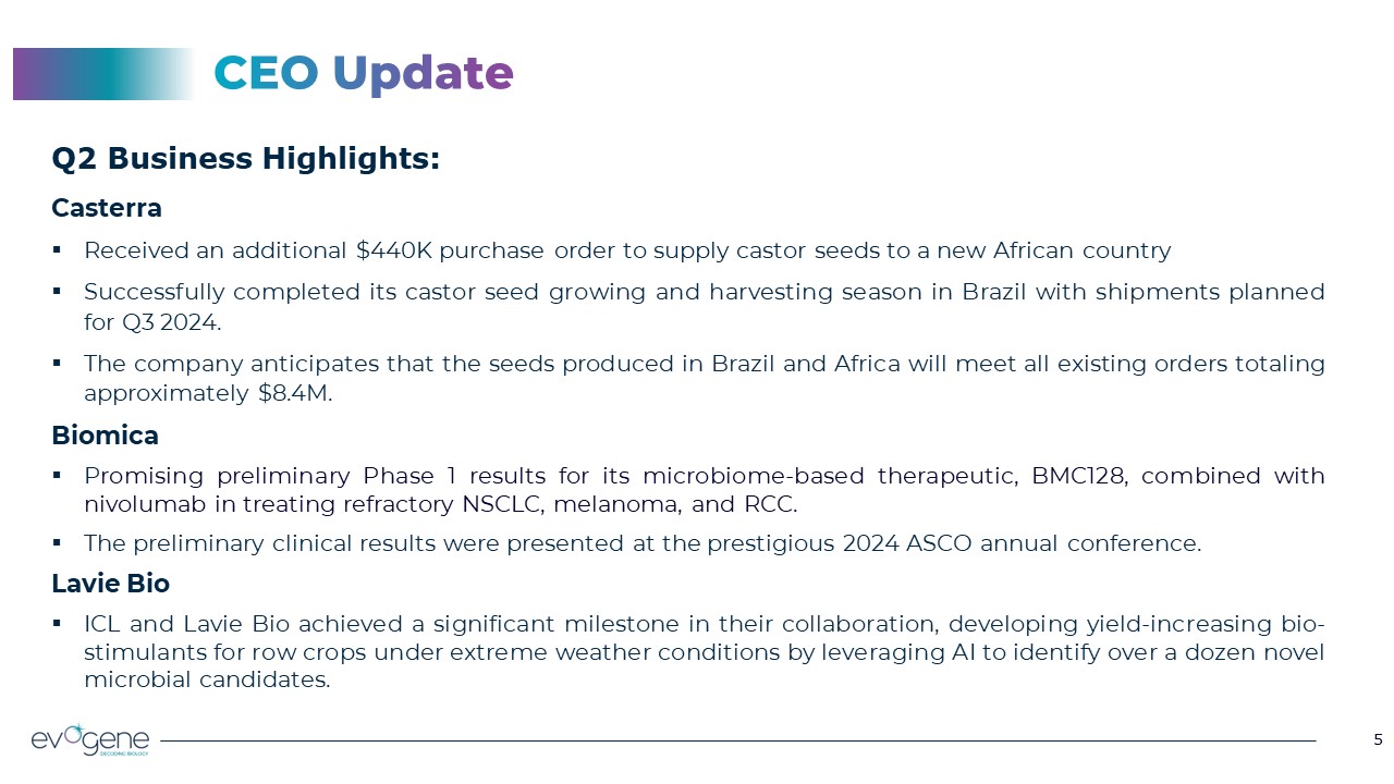 Q2 Business Highlights:  Casterra  Received an additional $440K purchase order to supply castor seeds to a new African country  Successfully completed its castor seed growing and harvesting season in Brazil with shipments planned for Q3 2024.  The company anticipates that the seeds produced in Brazil and Africa will meet all existing orders totaling approximately $8.4M.  Biomica  Promising preliminary Phase 1 results for its microbiome-based therapeutic, BMC128, combined with nivolumab in treating refractory NSCLC, melanoma, and RCC.   The preliminary clinical results were presented at the prestigious 2024 ASCO annual conference.  Lavie Bio  ICL and Lavie Bio achieved a significant milestone in their collaboration, developing yield-increasing bio-stimulants for row crops under extreme weather conditions by leveraging AI to identify over a dozen novel microbial candidates.  Announced the commercial expansion of Yalos™ to winter wheat with sales commencing across the US for the 2024-2025 season.  5  5  CEO Update