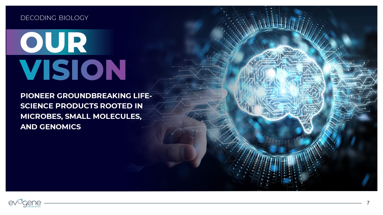 OUR VISION  PIONEER GROUNDBREAKING LIFE-SCIENCE PRODUCTS ROOTED IN MICROBES, SMALL MOLECULES, AND GENOMICS  DECODING BIOLOGY  7