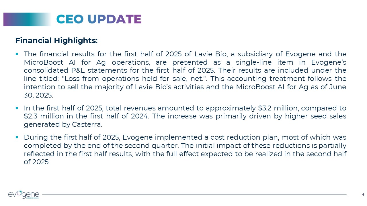 4  4  CEO UPDATE  Financial Highlights:  The financial results for the first half of 2025 of Lavie Bio, a subsidiary of Evogene and the MicroBoost AI for Ag operations, are presented as a single-line item in Evogene’s consolidated P&L statements for the first half of 2025. Their results are included under the line titled: "Loss from operations held for sale, net.". This accounting treatment follows the intention to sell the majority of Lavie Bio’s activities and the MicroBoost AI for Ag as of June 30, 2025.   In the first half of 2025, total revenues amounted to approximately $3.2 million, compared to $2.3 million in the first half of 2024. The increase was primarily driven by higher seed sales generated by Casterra.   During the first half of 2025, Evogene implemented a cost reduction plan, most of which was completed by the end of the second quarter. The initial impact of these reductions is partially reflected in the first half results, with the full effect expected to be realized in the second half of 2025.