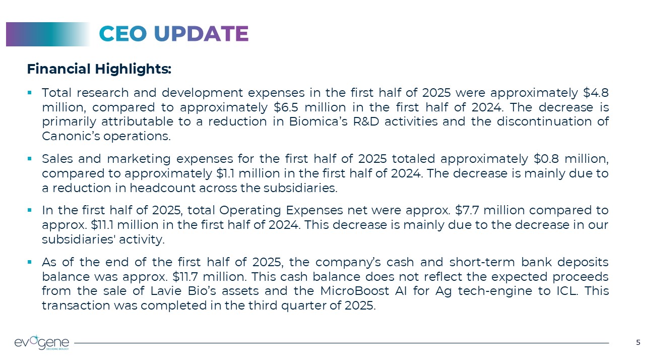 5  5  CEO UPDATE  Financial Highlights:  Total research and development expenses in the first half of 2025 were approximately $4.8 million, compared to approximately $6.5 million in the first half of 2024. The decrease is primarily attributable to a reduction in Biomica’s R&D activities and the discontinuation of Canonic’s operations.  Sales and marketing expenses for the first half of 2025 totaled approximately $0.8 million, compared to approximately $1.1 million in the first half of 2024. The decrease is mainly due to a reduction in headcount across the subsidiaries.  In the first half of 2025, total Operating Expenses net were approx. $7.7 million compared to approx. $11.1 million in the first half of 2024. This decrease is mainly due to the decrease in our subsidiaries' activity.  As of the end of the first half of 2025, the company’s cash and short-term bank deposits balance was approx. $11.7 million. This cash balance does not reflect the expected proceeds from the sale of Lavie Bio’s assets and the MicroBoost AI for Ag tech-engine to ICL. This transaction was completed in the third quarter of 2025.
