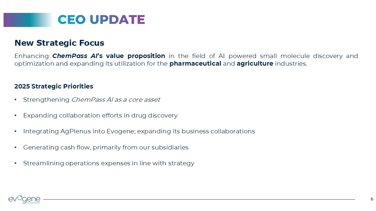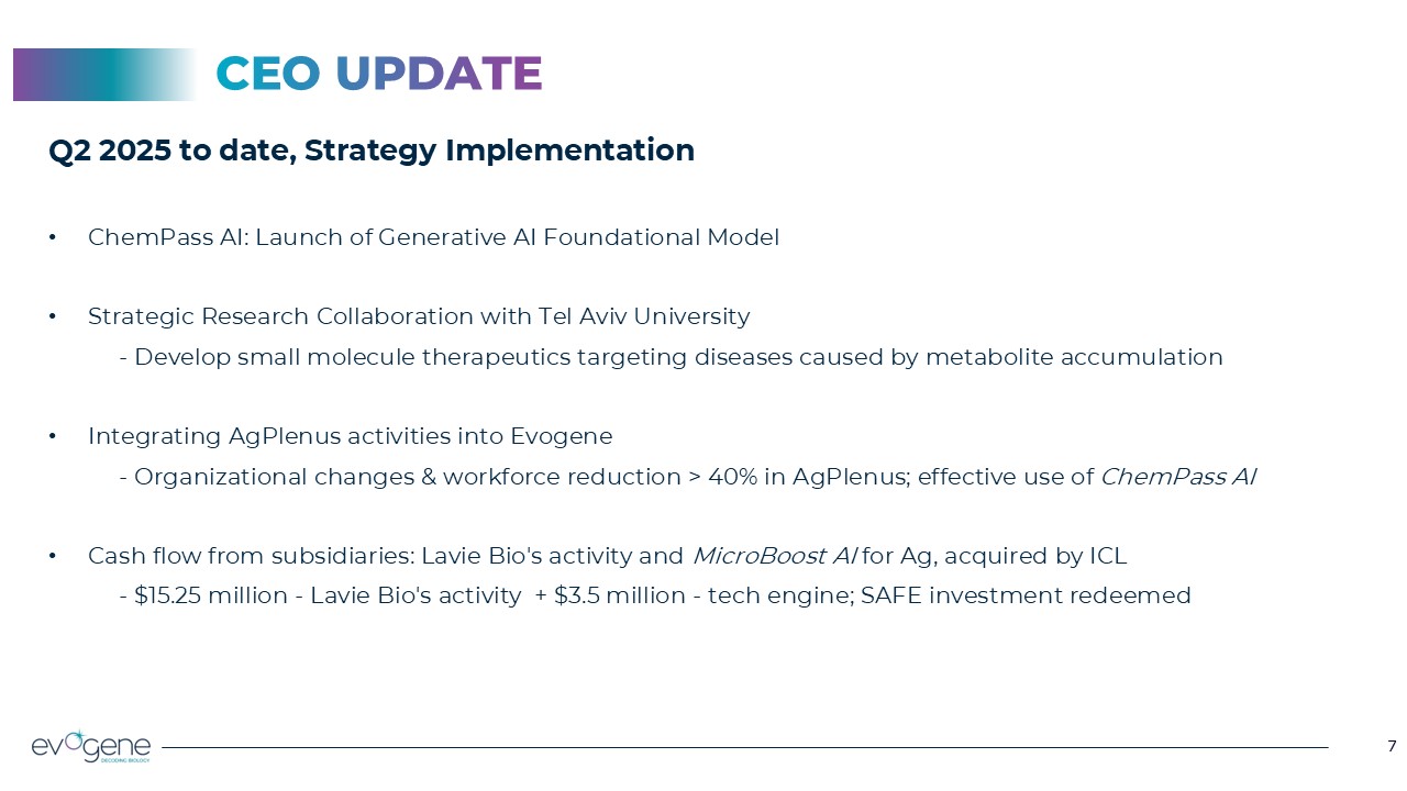 6  6  CEO UPDATE  New Strategic Focus  Enhancing ChemPass AI’s value proposition in the field of AI powered small molecule discovery and optimization and expanding its utilization for the pharmaceutical and agriculture industries.  2025 Strategic Priorities   Strengthening ChemPass AI as a core asset  Expanding collaboration efforts in drug discovery  Integrating AgPlenus into Evogene; expanding its business collaborations  Generating cash flow, primarily from our subsidiaries  Streamlining operations expenses in line with strategy
