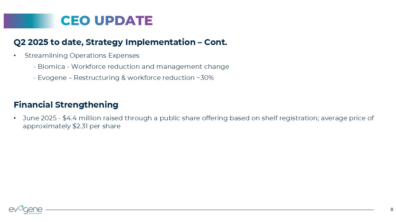 8  8  CEO UPDATE  Q2 2025 to date, Strategy Implementation – Cont.  Streamlining Operations Expenses      - Biomica - Workforce reduction and management change     - Evogene – Restructuring & workforce reduction ~30%  Financial Strengthening  June 2025 - $4.4 million raised through a public share offering based on shelf registration; average price of approximately $2.31 per share