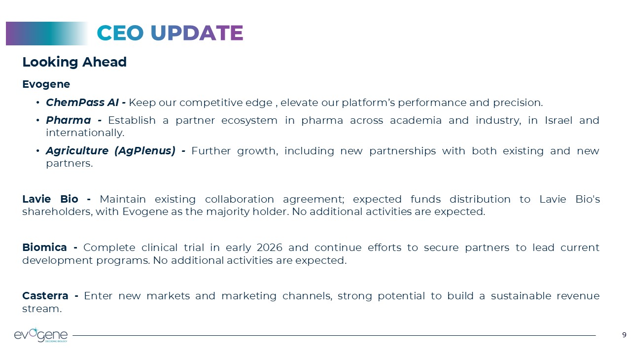 Looking Ahead  Evogene   ChemPass AI - Keep our competitive edge , elevate our platform’s performance and precision.  Pharma - Establish a partner ecosystem in pharma across academia and industry, in Israel and internationally.  Agriculture (AgPlenus) - Further growth, including new partnerships with both existing and new partners.  Lavie Bio - Maintain existing collaboration agreement; expected funds distribution to Lavie Bio's shareholders, with Evogene as the majority holder. No additional activities are expected.  Biomica - Complete clinical trial in early 2026 and continue efforts to secure partners to lead current development programs. No additional activities are expected.  Casterra - Enter new markets and marketing channels, strong potential to build a sustainable revenue stream.   9  9  CEO UPDATE
