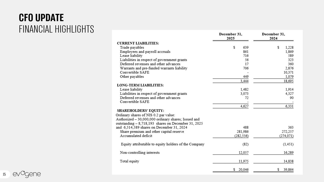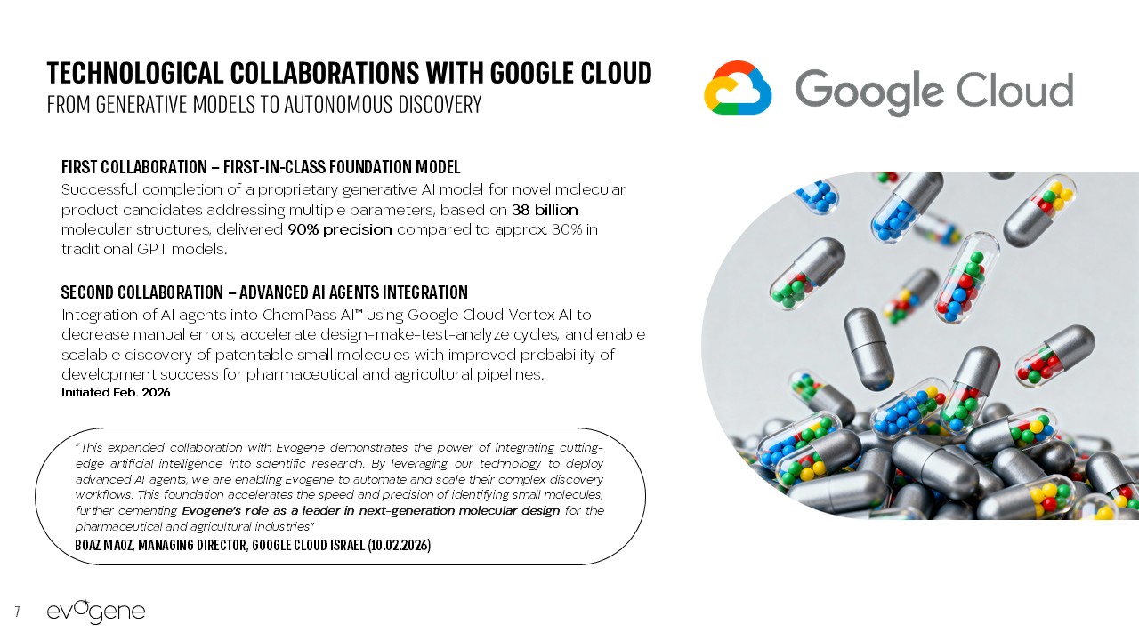 7  Technological Collaborations with GOOGLE CLOUDfrom generative models to autonomous discovery   First Collaboration – FIRST-IN-CLASS FOUNDATION MODEL  Successful completion of a proprietary generative AI model for novel molecular product candidates addressing multiple parameters, based on 38 billion molecular structures, delivered 90% precision compared to approx. 30% in traditional GPT models.  Second Collaboration – ADVANCED AI AGENTS INTEGRATION   Integration of AI agents into ChemPass AI™ using Google Cloud Vertex AI to decrease manual errors, accelerate design-make-test-analyze cycles, and enable scalable discovery of patentable small molecules with improved probability of development success for pharmaceutical and agricultural pipelines.   Initiated Feb. 2026  “This expanded collaboration with Evogene demonstrates the power of integrating cutting-edge artificial intelligence into scientific research. By leveraging our technology to deploy advanced AI agents, we are enabling Evogene to automate and scale their complex discovery workflows. This foundation accelerates the speed and precision of identifying small molecules, further cementing Evogene's role as a leader in next-generation molecular design for the pharmaceutical and agricultural industries”  BOAZ MAOZ, MANAGING DIRECTOR, GOOGLE CLOUD ISRAEL (10.02.2026)
