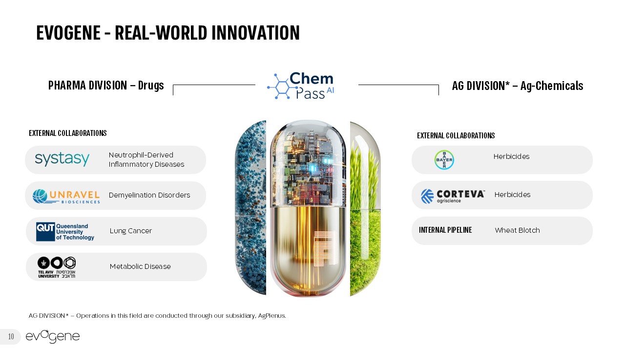 10  PHARMA DIVISION – Drugs  EXTERNAL COLLABORATIONS  Neutrophil-Derived Inflammatory Diseases  Demyelination Disorders  Lung Cancer  Metabolic Disease  EXTERNAL COLLABORATIONS  Herbicides   Herbicides   INTERNAL PIPELINE  Wheat Blotch  EVOGENE - REAL-WORLD INNOVATION  AG DIVISION* – Ag-Chemicals  AG DIVISION* – Operations in this field are conducted through our subsidiary, AgPlenus.
