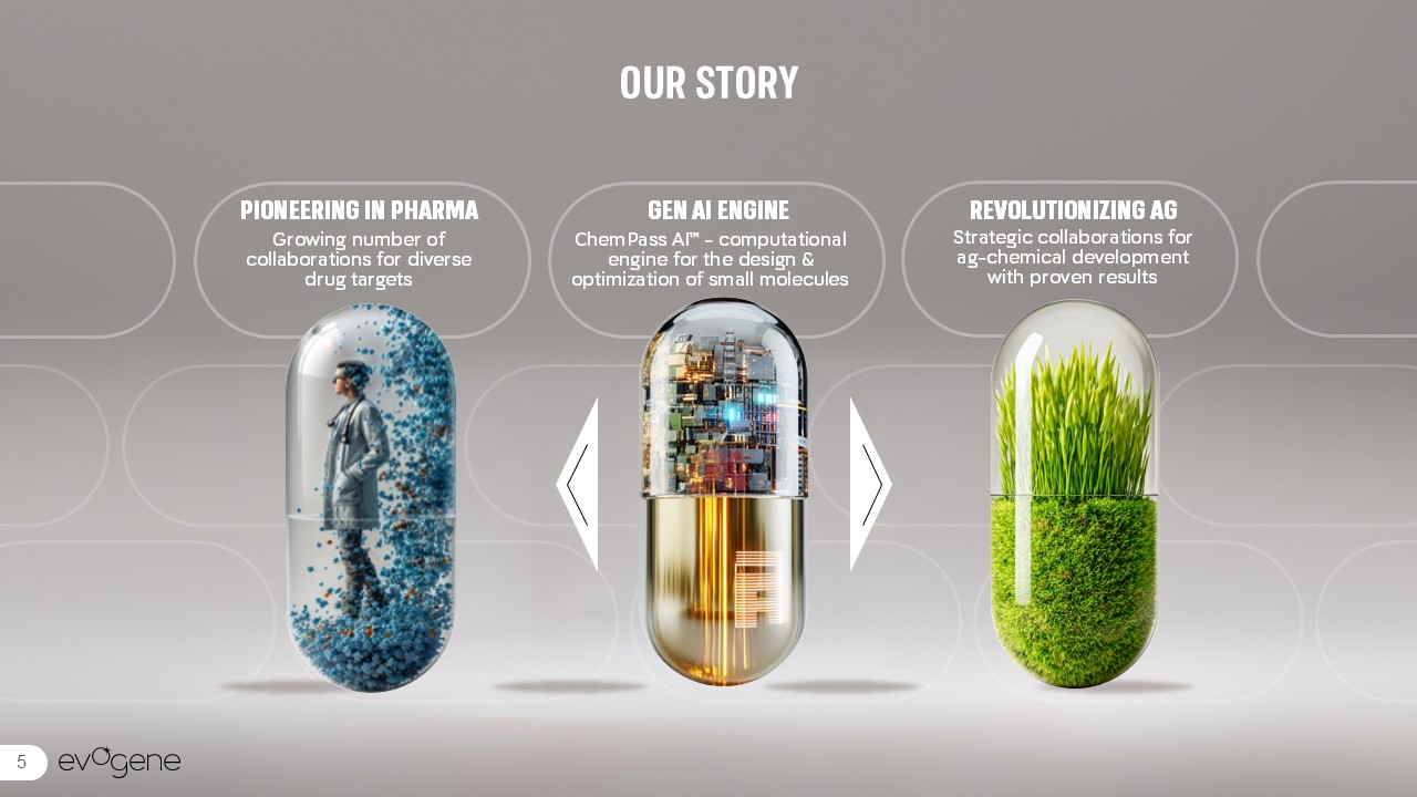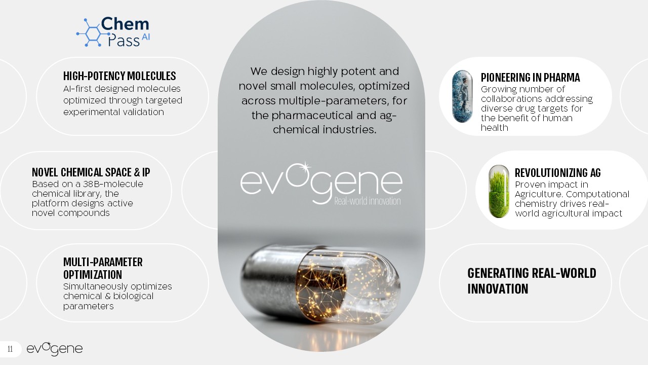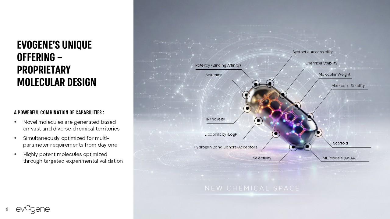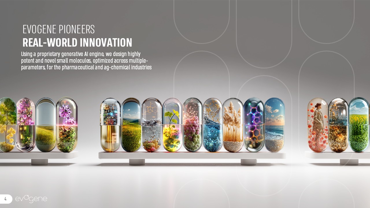 EVOGENE PIONEERSREAL-WORLD INNOVATION   Using a proprietary generative AI engine, we design highly potent and novel small molecules, optimized across multiple-parameters, for the pharmaceutical and ag-chemical industries  4