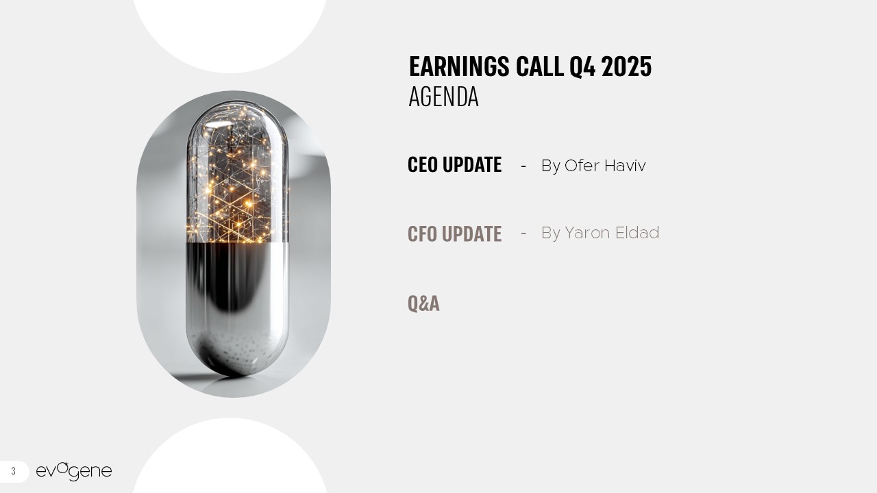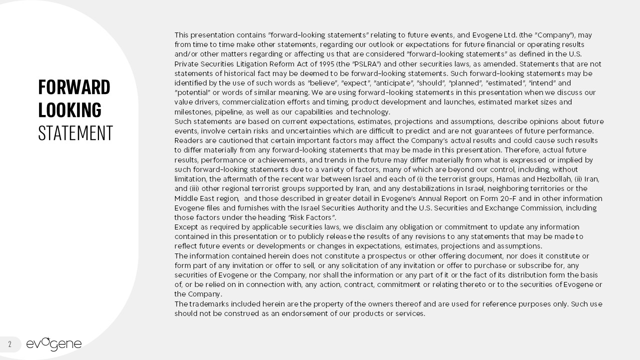 FORWARD LOOKING STATEMENT  This presentation contains "forward-looking statements" relating to future events, and Evogene Ltd. (the “Company”), may from time to time make other statements, regarding our outlook or expectations for future financial or operating results and/or other matters regarding or affecting us that are considered “forward-looking statements” as defined in the U.S. Private Securities Litigation Reform Act of 1995 (the “PSLRA”) and other securities laws, as amended. Statements that are not statements of historical fact may be deemed to be forward-looking statements. Such forward-looking statements may be identified by the use of such words as “believe”, “expect”, “anticipate”, “should”, “planned”, “estimated”, “intend” and “potential” or words of similar meaning. We are using forward-looking statements in this presentation when we discuss our value drivers, commercialization efforts and timing, product development and launches, estimated market sizes and milestones, pipeline, as well as our capabilities and technology.   Such statements are based on current expectations, estimates, projections and assumptions, describe opinions about future events, involve certain risks and uncertainties which are difficult to predict and are not guarantees of future performance. Readers are cautioned that certain important factors may affect the Company's actual results and could cause such results to differ materially from any forward-looking statements that may be made in this presentation. Therefore, actual future results, performance or achievements, and trends in the future may differ materially from what is expressed or implied by such forward-looking statements due to a variety of factors, many of which are beyond our control, including, without limitation, the aftermath of the recent war between Israel and each of (i) the terrorist groups, Hamas and Hezbollah, (ii) Iran, and (iii) other regional terrorist groups supported by Iran, and any destabilizations in Israel, neighboring territories or the Middle East region,  and those described in greater detail in Evogene's Annual Report on Form 20-F and in other information Evogene files and furnishes with the Israel Securities Authority and the U.S. Securities and Exchange Commission, including those factors under the heading “Risk Factors”.   Except as required by applicable securities laws, we disclaim any obligation or commitment to update any information contained in this presentation or to publicly release the results of any revisions to any statements that may be made to reflect future events or developments or changes in expectations, estimates, projections and assumptions.  The information contained herein does not constitute a prospectus or other offering document, nor does it constitute or form part of any invitation or offer to sell, or any solicitation of any invitation or offer to purchase or subscribe for, any securities of Evogene or the Company, nor shall the information or any part of it or the fact of its distribution form the basis of, or be relied on in connection with, any action, contract, commitment or relating thereto or to the securities of Evogene or the Company.  The trademarks included herein are the property of the owners thereof and are used for reference purposes only. Such use should not be construed as an endorsement of our products or services.  2