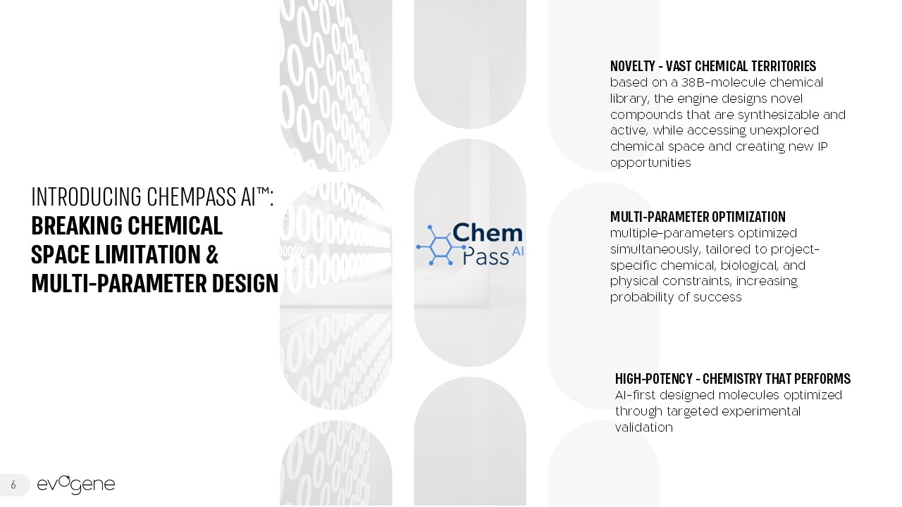 NOVELTY - VAST CHEMICAL TERRITORIES  based on a 38B-molecule chemical library, the engine designs novel compounds that are synthesizable and active, while accessing unexplored chemical space and creating new IP opportunities  INTRODUCING CHEMPASS AI™:   BREAKING CHEMICAL SPACE LIMITATION &  MULTI-PARAMETER DESIGN   HIGH-POTENCY - CHEMISTRY THAT PERFORMS  AI-first designed molecules optimized through targeted experimental validation  MULTI-PARAMETER OPTIMIZATIONmultiple-parameters optimized simultaneously, tailored to project-specific chemical, biological, and physical constraints, increasing probability of success  6