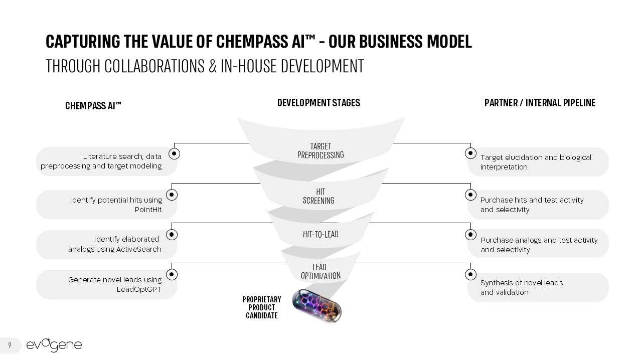 Potency (Binding Affinity)  Selectivity  ML Models (QSAR)  Scaffold  Solubility  Lipophilicity (LogP)  Molecular Weight  Hydrogen Bond Donors/Acceptors  Chemical Stability  Metabolic Stability  Synthetic Accessibility  IP/Novelty  EVOGENE’S UNIQUE OFFERING –   PROPRIETARY   MOLECULAR DESIGN  8  A POWERFUL COMBINATION OF CAPABILITIES :  Novel molecules are generated based on vast and diverse chemical territories  Simultaneously optimized for multi-parameter requirements from day one  Highly potent molecules optimized through targeted experimental validation