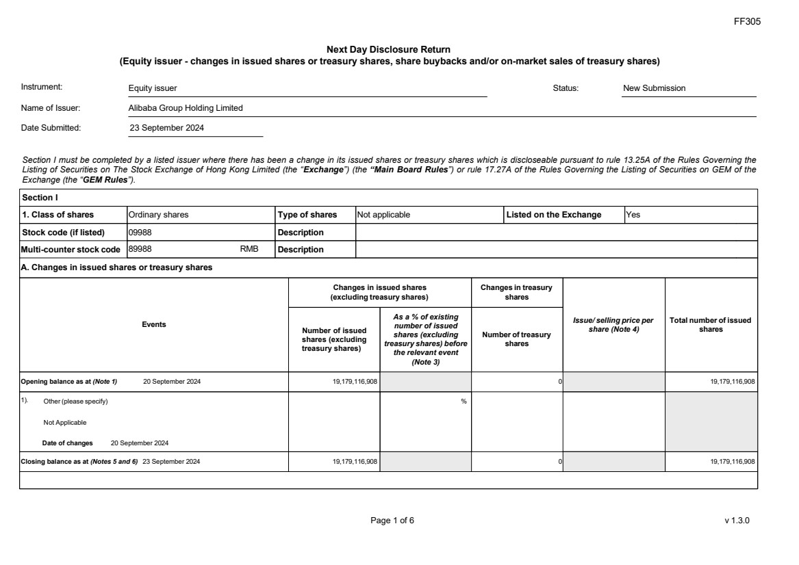 FF305 Next Day Disclosure Return (Equity issuer - changes in issued shares or treasury shares, share buybacks and/or on-market sales of treasury shares) Instrument: Equity issuer Status: New Submission Name of Issuer: Alibaba Group Holding Limited Date Submitted: 23 September 2024 Section I must be completed by a listed issuer where there has been a change in its issued shares or treasury shares which is discloseable pursuant to rule 13.25A of the Rules Governing the Listing of Securities on The Stock Exchange of Hong Kong Limited (the “Exchange”) (the “Main Board Rules”) or rule 17.27A of the Rules Governing the Listing of Securities on GEM of the Exchange (the “GEM Rules”). Page 1 of 6 v 1.3.0 Section I 1. Class of shares Ordinary shares Type of shares Not applicable Listed on the Exchange Yes Stock code (if listed) 09988 Description Multi-counter stock code 89988 RMB Description A. Changes in issued shares or treasury shares Events Changes in issued shares (excluding treasury shares) Changes in treasury shares Issue/ selling price per share (Note 4) Total number of issued Number of issued shares shares (excluding treasury shares) As a % of existing number of issued shares (excluding treasury shares) before the relevant event (Note 3) Number of treasury shares Opening balance as at (Note 1) 20 September 2024 19,179,116,908 0 19,179,116,908 1). Other (please specify) Not Applicable Date of changes 20 September 2024 % Closing balance as at (Notes 5 and 6) 23 September 2024 19,179,116,908 0 19,179,116,908