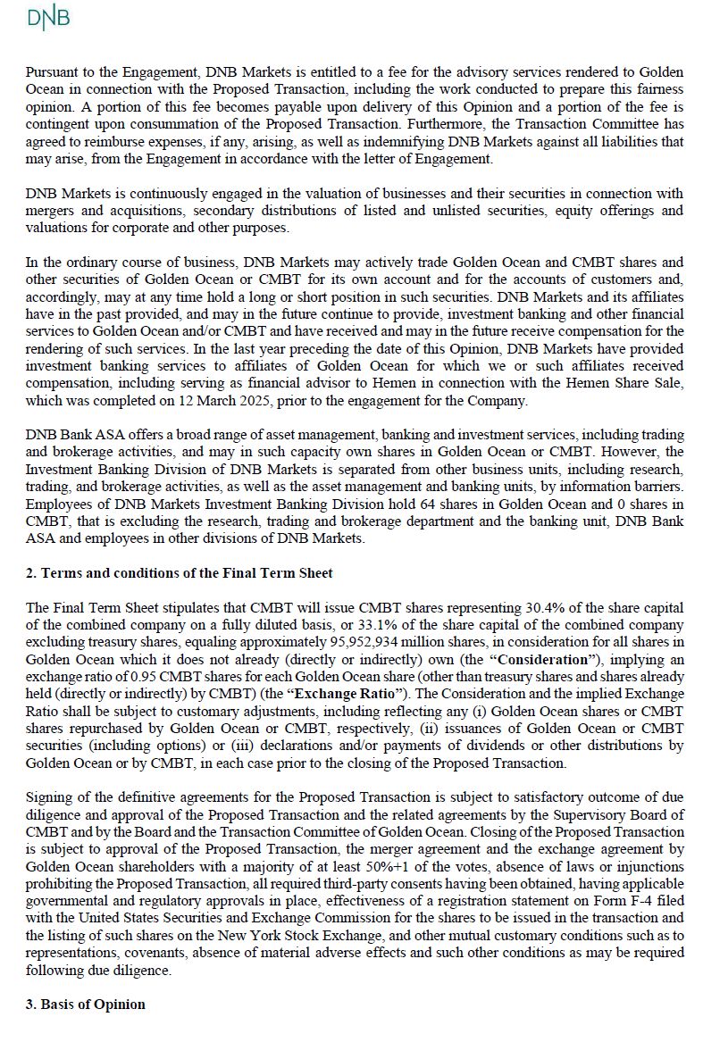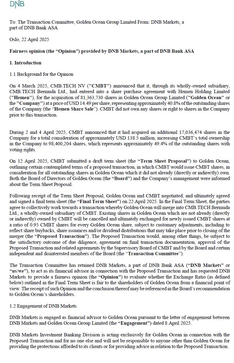 The information contained in this Exemption Document relates to the Merger as contemplated by the agreement and plan of merger entered into on 28 May 2025 between CMB.TECH, CMB.TECH Bermuda and Golden Ocean (the “Merger Agreement”) pursuant to which, subject to satisfaction or (to the extent permitted by law) waiver of specified closing conditions, including in particular approval of Golden Ocean shareholders: