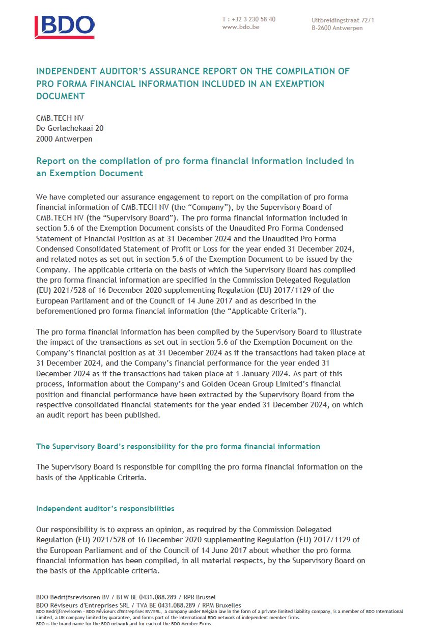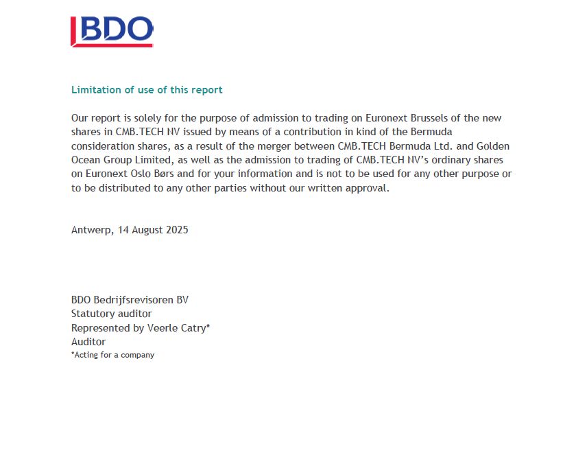 This exemption document (the “Exemption Document”) has been prepared by CMB.TECH NV (“CMB.TECH” or the “Issuer”) in relation to the admission to trading on the regulated market of Euronext Brussels (“Euronext Brussels”) of 95,952,934 new shares in CMB.TECH (the “Consideration Shares”) to be issued in connection with the contemplated Merger (as defined below) between CMB.TECH Bermuda Ltd., a wholly owned subsidiary of CMB.TECH (“CMB.TECH Bermuda”), and Golden Ocean Group Limited (“Golden Ocean”), as well as admission to trading of CMB.TECH’s ordinary shares, including the Consideration Shares, on the regulated market Euronext Oslo Børs (“Euronext Oslo”).